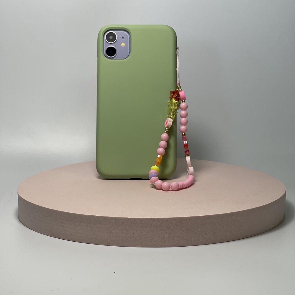 • Bijoux de téléphone Flore 30 cm perles mats vertes avec mousquetons dorés