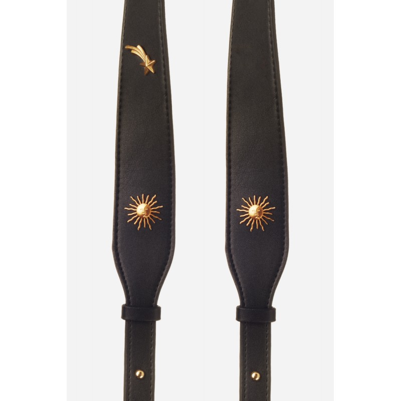 Lanière Sangle Charlotte 120 cm, cuir vegan avec soleils dorés et mousquetons dorés