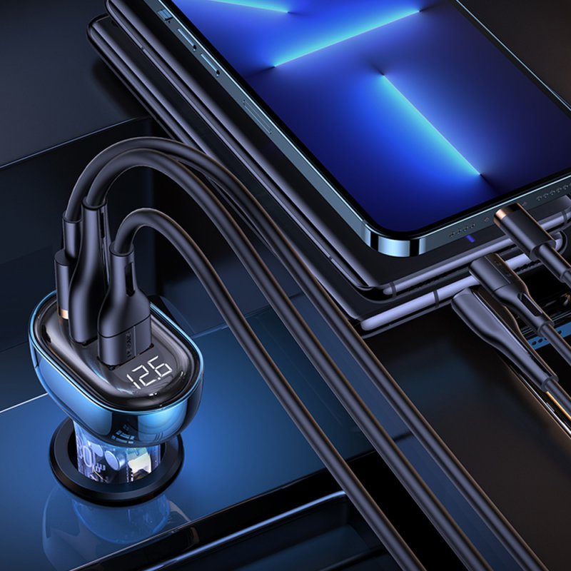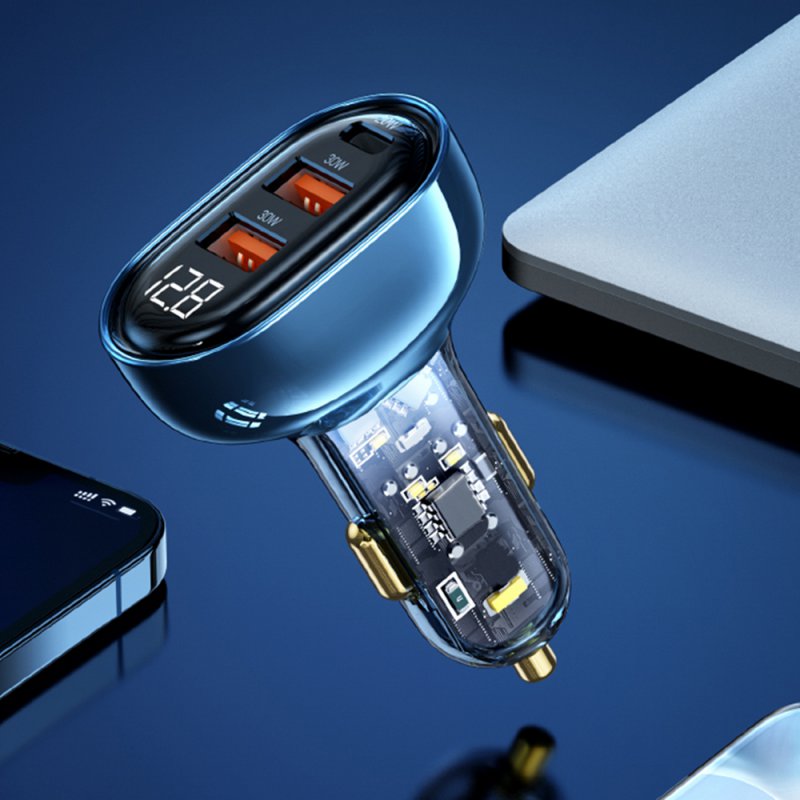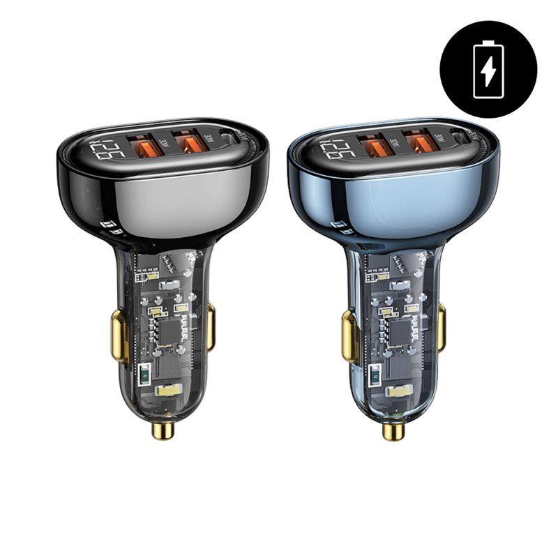 • Chargeur de voiture rapide avec affichage numérique et 3 ports USB 30w + USB 30W + USB C 20W - noir transparent