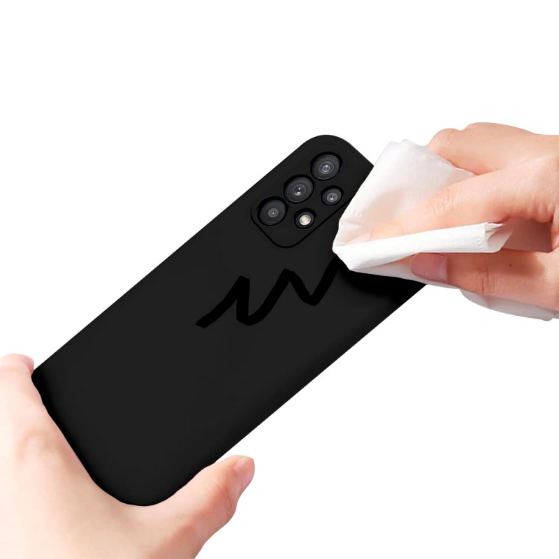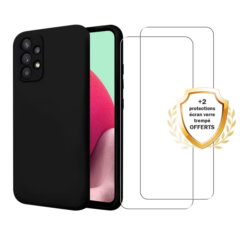 Pack coque silicone liquide noire + 2 verres trempés, offrant une protection intégrale compatible avec votre Galaxy A32 contre les chocs, les rayures et la poussière. Compatible avec chargement sans fil (induction). Kit de nettoyage et d'installation inclus.