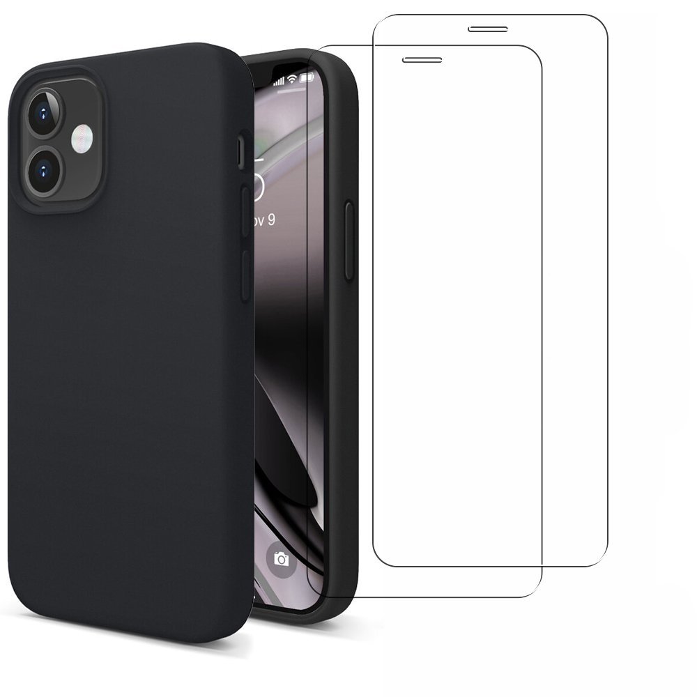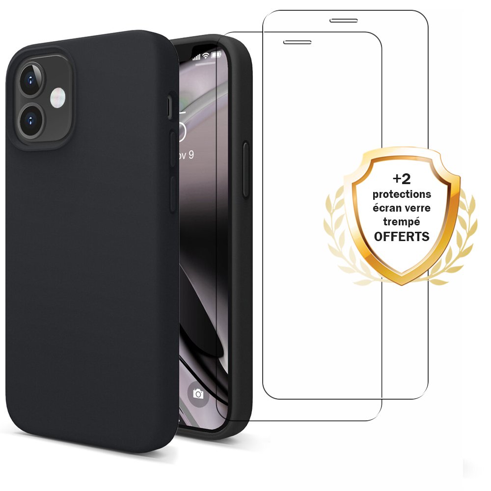 • > Coques >Coque iPhone 12 Mini Silicone liquide Noire + 2 Vitres en Verre trempé Protection écran Antichocs