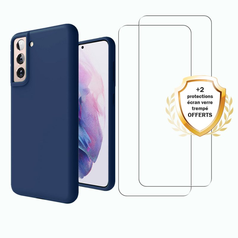 • > Coques >Coque Samsung Galaxy S21 5G Silicone Liquide Bleue + 2 Vitres en Verre Trempé Protection écran