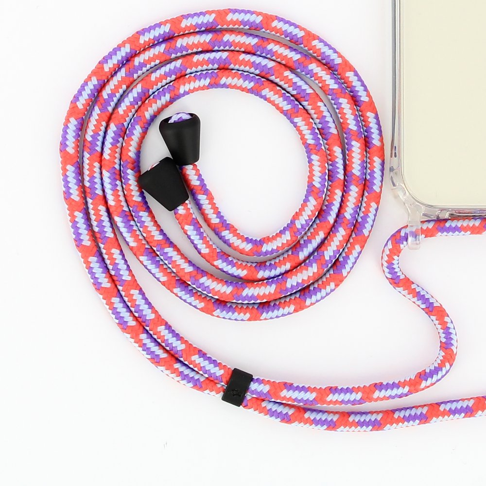 Lanière cordon en coton tressée avec embout en métal noir mat, coloris orange, violet et gris