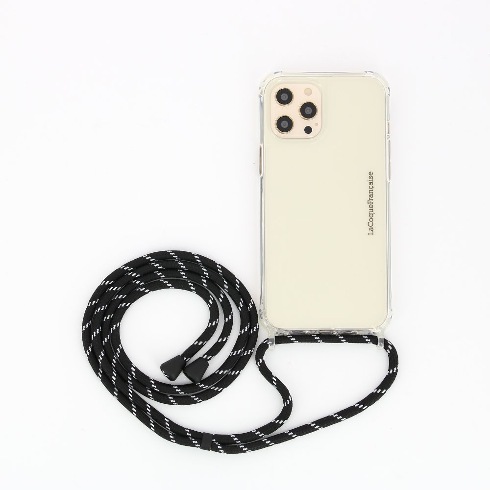 • > High Tech>Gadgets>Cordons>Lanière cordon Lilou en coton tressée avec embout en métal noir mat, coloris noir et pointillés blanc
