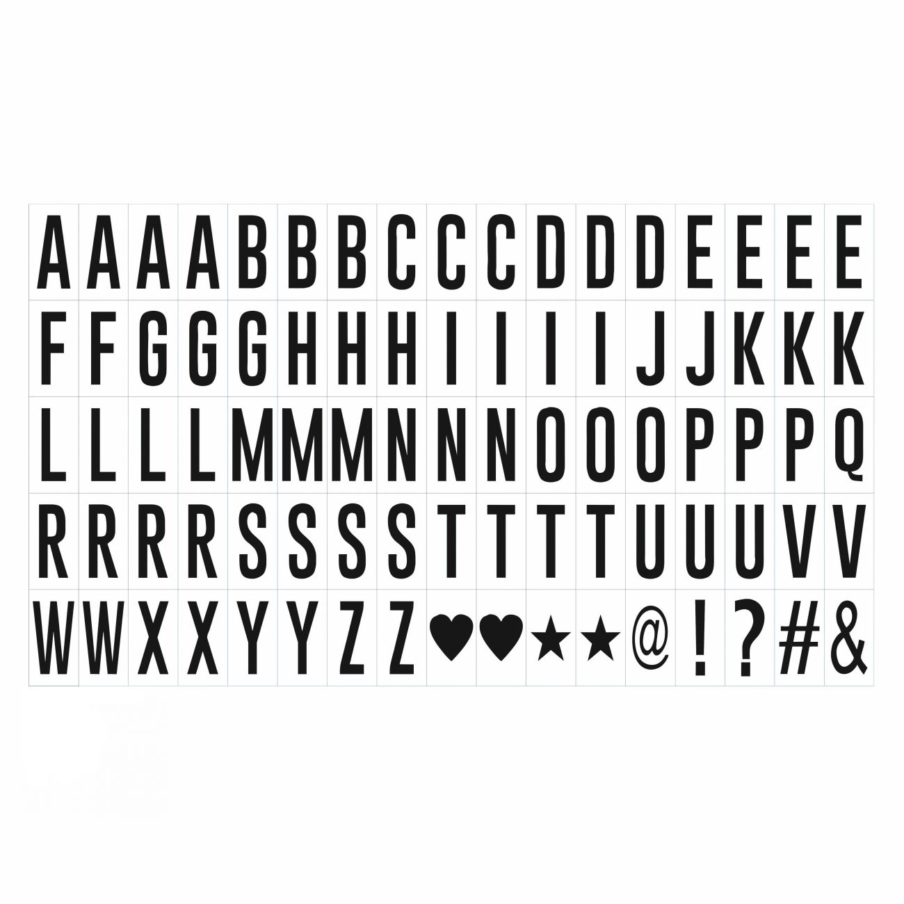 -85 lettres et symboles : 4 x A, 3 x B, 3 x C, 3 x D, 4 x E, 2 x F, 3 x G, 3 x H, 4 x I , 2 x J, 3 x K, 4 x L, 3 x M, 3 x N, 3 x N, 3 x O, 3 x P, 1 x Q, 4 x R, 4 x S, 4 x T, 3 x U, 2 x V, 2 x W, 2 x X, 2 x Y, 2 x Z, 1 x @ , 1x ! , 1x ?, 1 x # , 1 x &, 2x forme de coeur, 2 x forme d’étoile