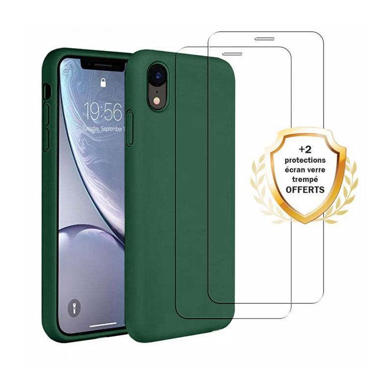 Coque iPhone XR Silicone liquide Vert Foret + 2 Vitres en Verre trempé Protection écran Antichocs