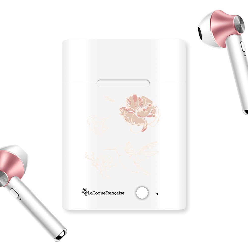 Ecouteurs Sans Fil Bluetooth Rose Gold Fleurs Blanches Ecriture Tendance et Design La Coque Francaise