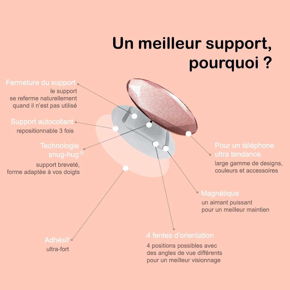 Ce support est conçu pour améliorer vos textos, vos tapotements, vos photos, vos conversations, vos tournages et votre expérience téléphonique globale, tout en vous exprimant à travers un design amusant et audacieux.