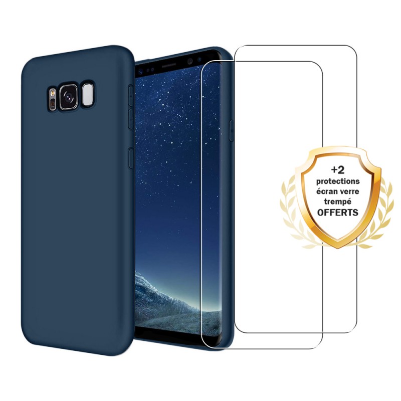 • > High Tech>Coque + 2 Vitres Offertes >Coque Samsung Galaxy S8 Silicone liquide Bleu Marine + 2 Vitres en Verre trempé Protection écran Antichocs