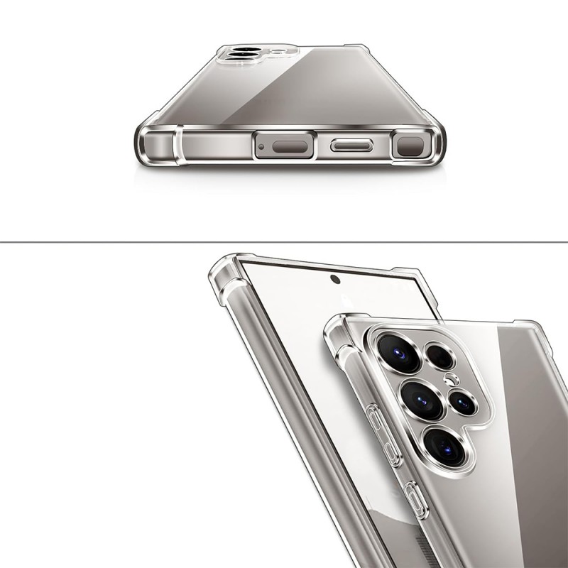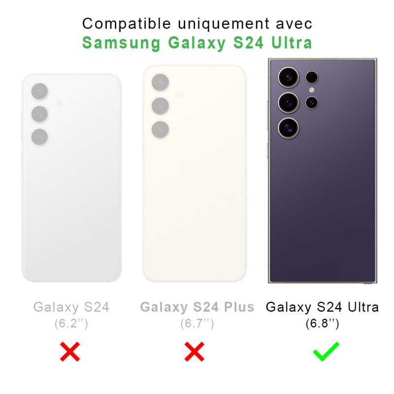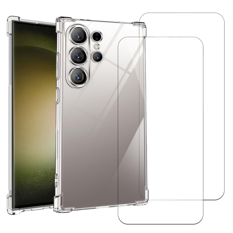 Pack coque anti-choc transparent + 2 verres trempés, offrant une protection intégrale compatible avec votre Galaxy S24 Ultra contre les chocs, les rayures et la poussière. Kit de nettoyage et d'installation inclus.
