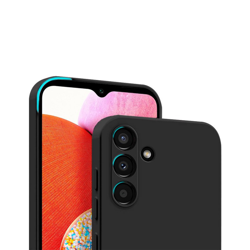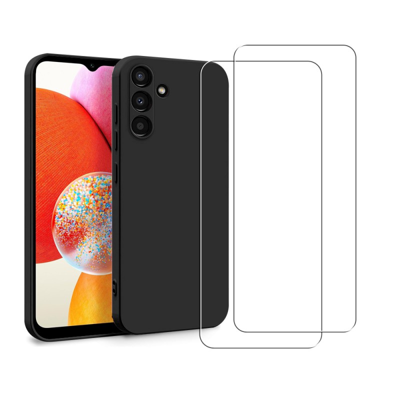 Pack coque silicone liquide noire + 2 verres trempés compatible Galaxy A14 offrant une protection intégrale contre les chocs, les rayures et la poussière. Les fonctionnalités tactiles de l'écran sont préservées.