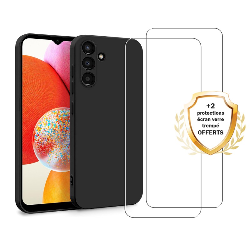• Coque Samsung Galaxy A14 Silicone liquide Noire + 2 Vitres en Verre trempé Protection écran Antichocs