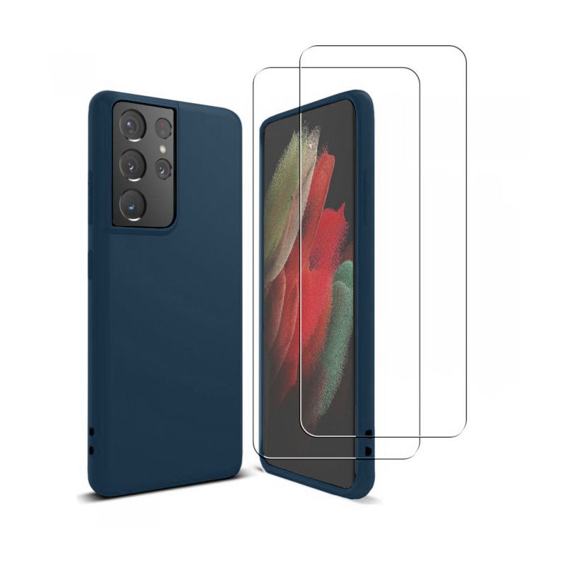 • Coque Samsung Galaxy S21 Ultra 5G Silicone liquide Bleu Marine + 2 Vitres en Verre trempé Protection écran Antichocs