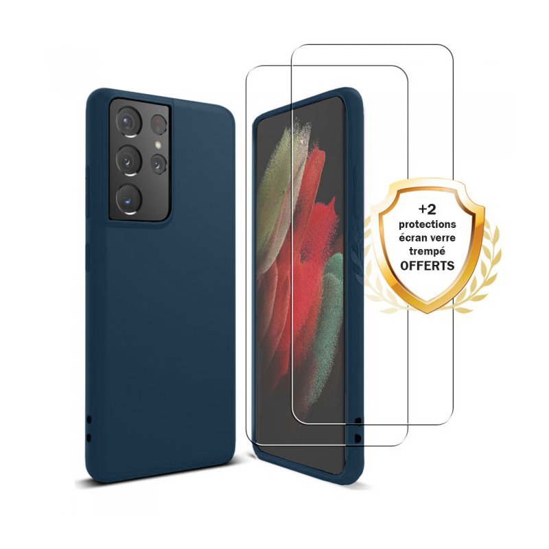 • > Coques >Coque Samsung Galaxy S21 Ultra 5G Silicone liquide Bleu Marine + 2 Vitres en Verre trempé Protection écran Antichocs