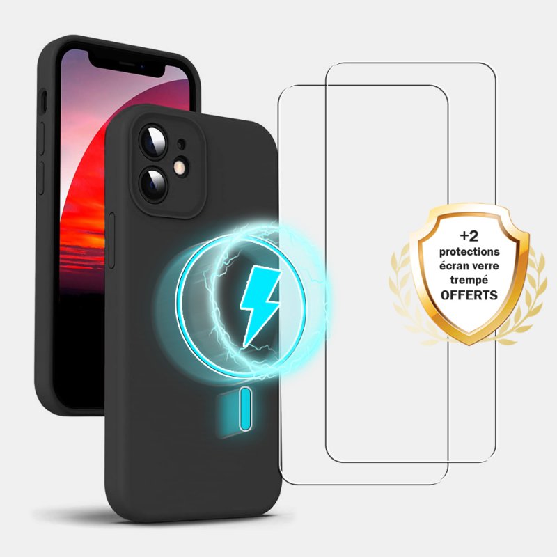 Coque iPhone 12 Mini + 2 Vitres en Verre Trempé Noire Silicone liquide Compatible MagSafe