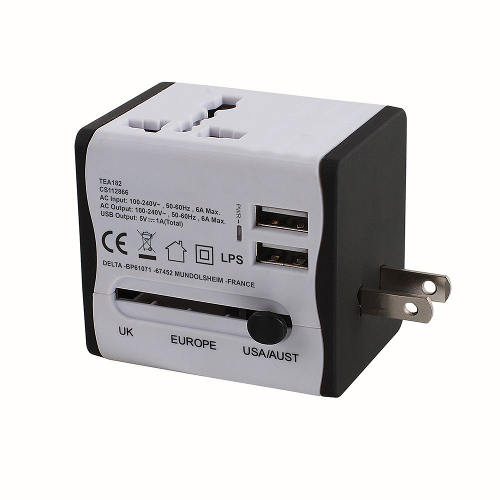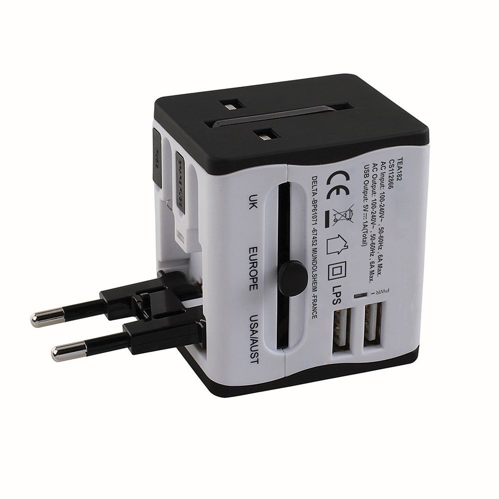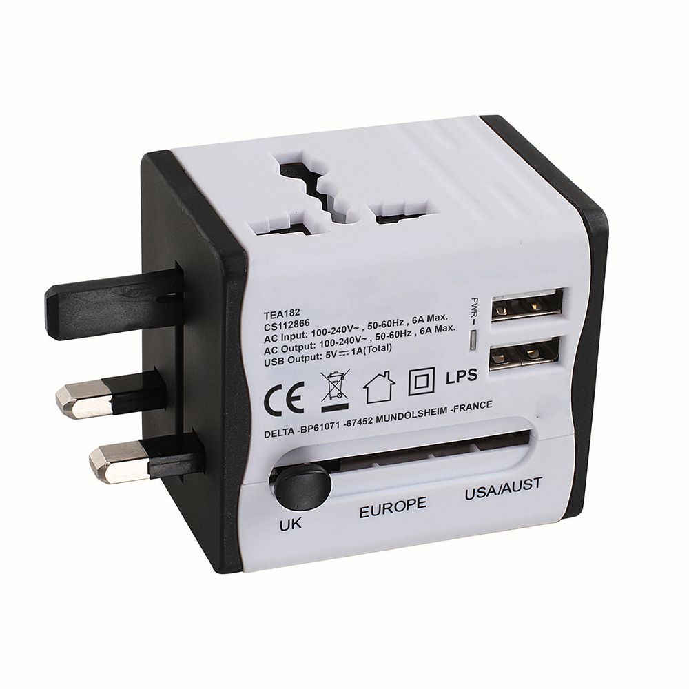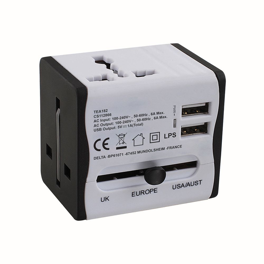 Adaptateur de voyage universel.Convient pour plus de 150 pays.2 ports USB.Voyant de fonctionnement.Prise UK : Grande Bretagne, Singapour, Hong.Kong, Inde, Malaisie, Maldives, Bhoutan, Kenya, etc. Prise Europe : France, Allemagne, Italie, Espagne, Finlande, Belgique, Autriche, etc. Prise USA : Chine, USA, Canada, Taiwan, Japon, Colombie, Mexique, Panama, Thaïlande, Vietnam. Prise Australie : Australie, Nouvelle Zélande, Turquie, Iran, Argentine, Pakistan, etc. Fusible de rechange intégré.