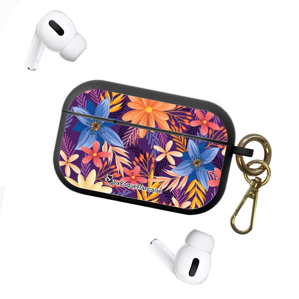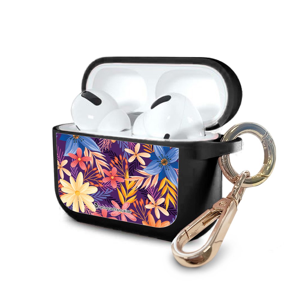 • Housse pour Airpods Pro silicone liquide noir Fleurs violettes et oranges Motif Ecriture Tendance La Coque Francaise