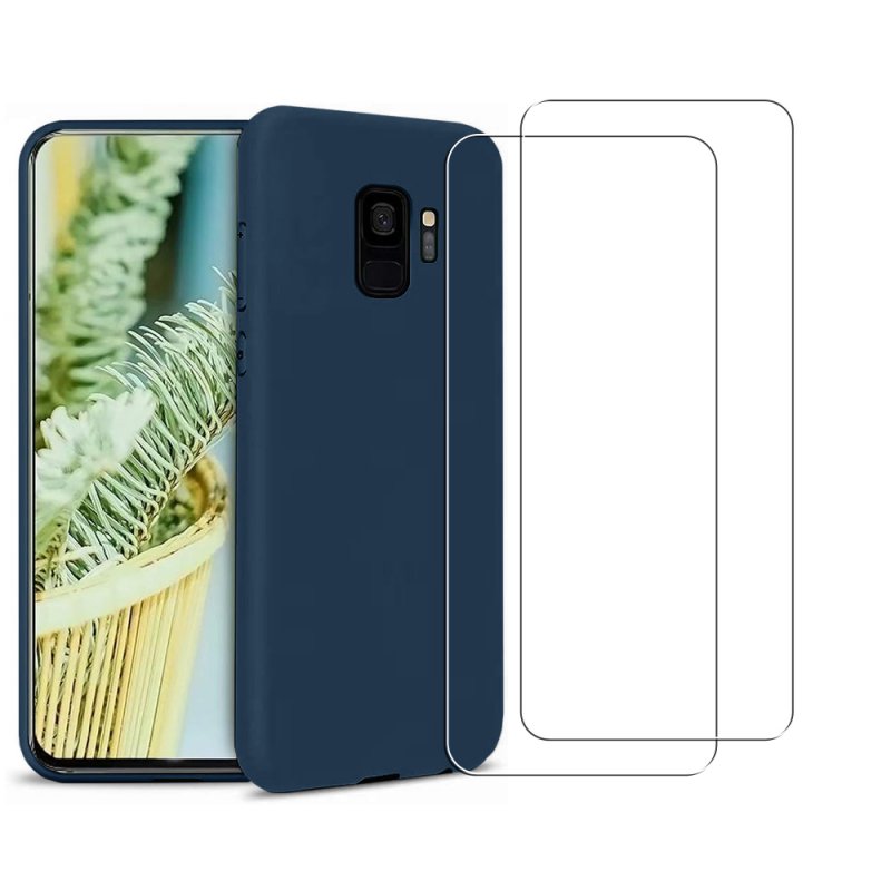 • Coque Samsung Galaxy S9 Silicone liquide Bleu Marine + 2 Vitres en Verre trempé Protection écran Antichocs
