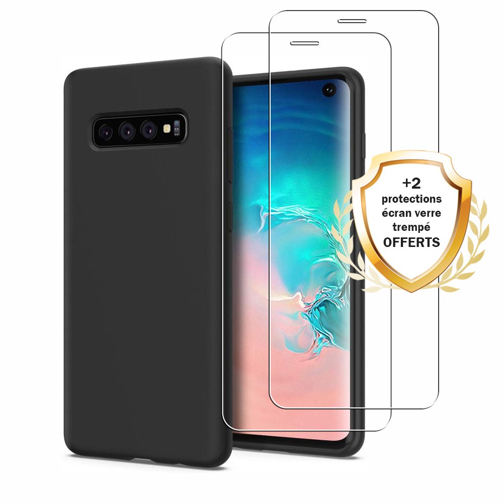 • > Coques>Coque Samsung Galaxy S10 Silicone liquide Noire + 2 Vitres en Verre trempé Protection écran Antichocs