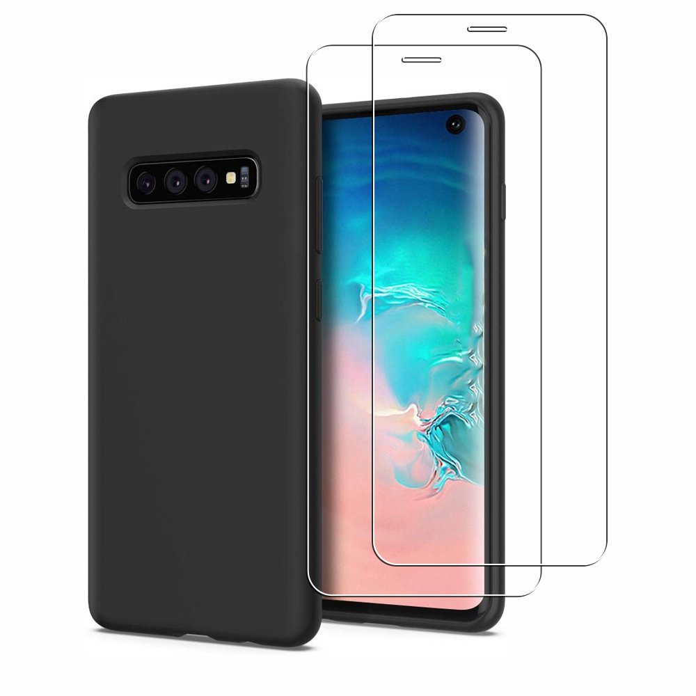 •  Coque Samsung Galaxy S10 Silicone liquide Noire + 2 Vitres en Verre trempé Protection écran Antichocs