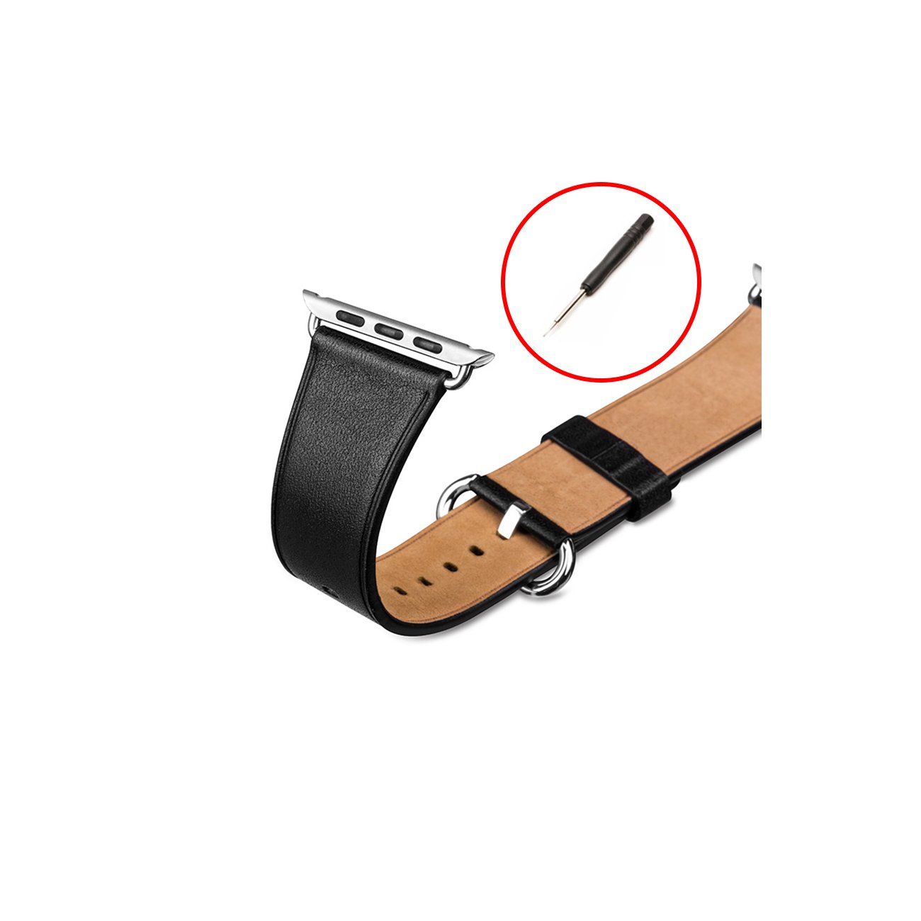 • > High Tech>Objets connectés>Accessoires Apple Watch>Bracelet aspect cuir noir réglable compatible avec Apple Watch 38 mm + Visse d'installation