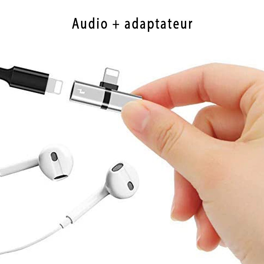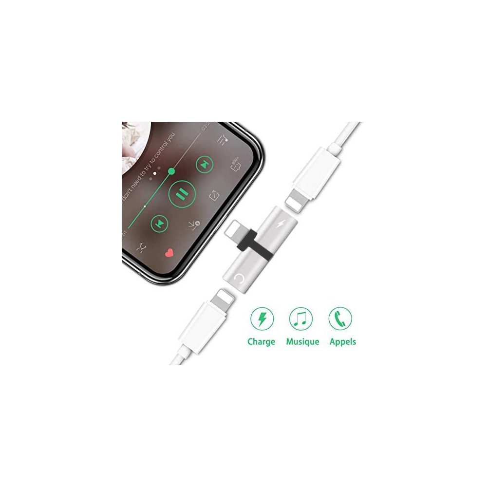 Adaptateur double pour iPhone, supporte tout appareil Lightning Conception: Il a 2 ports, un pour charger et l'autre pour le port audioConnectez le chargeur 8 pin et la prise casque, écoutez de la musique et utilisez cet adaptateur pour charger en même temps. Cet adaptateur de double port supporte une sortie audio , ce qui permet la qualité sonore des écouteurs Apple Lightning compatible d’être fidèle à la qualité sonore originaleVeuillez noter - Pour un fonctionnement correct, connectez d'abord le câble de charge et les écouteurs à l'adaptateur, puis connectez l'adaptateur à l'iPhone