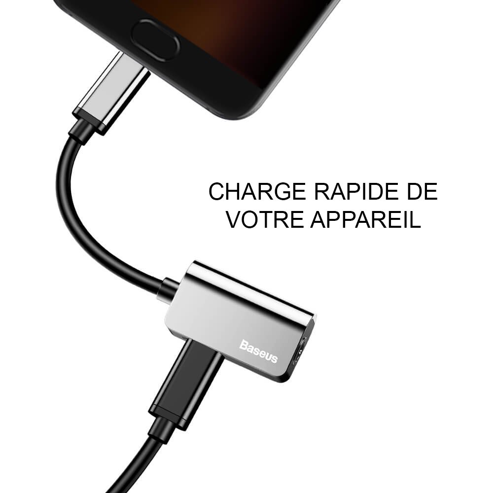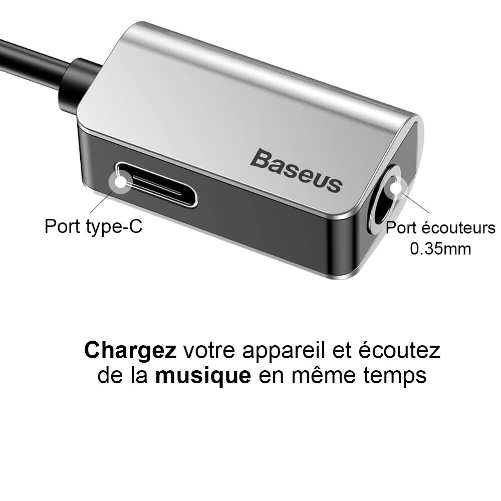 Cependant grâce à cet adaptateur Baseus, vous pourrez connecter simultanément un casque 3,5 mm et un câble USB-C, ce qui vous permet d'écouter de la musique via la prise audio 3,5 mm tout en laissant votre téléphone se recharger.