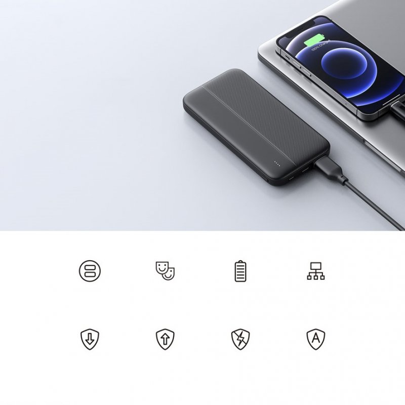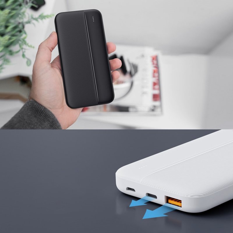 Grâce à la batterie vous chargerez efficacement n'importe quel appareil mobile. Utile en cas d'urgence, loin de chez soi et en déplacement. La conception légère et compacte permet un transport facile - l'accessoire tient dans un sac à main ou un sac à dos. Le powerbank a une capacité de 10 000 mAh ce qui permet de charger un smartphone avec une batterie standard jusqu'à trois fois. Deux entrées de charge - USB classique et USB-C de nouvelle génération - permettent de charger simultanément deux appareils à des vitesses vertigineuses. La puissance de sortie atteint jusqu'à 20W. L'entrée USB-C et microUSB sera utilisée pour reconstituer l'énergie dans la banque d'alimentation. Le système de charge intelligent coupe l'alimentation lorsque la batterie est pleine. Cette technologie protège la batterie. La sécurité d'utilisation est assurée par un certain nombre de normes de protection adoptées - protection contre les surtensions, protection contre les surcharges, protection contre les courts-circuits. L'affichage à quatre LED indique le niveau de charge.
