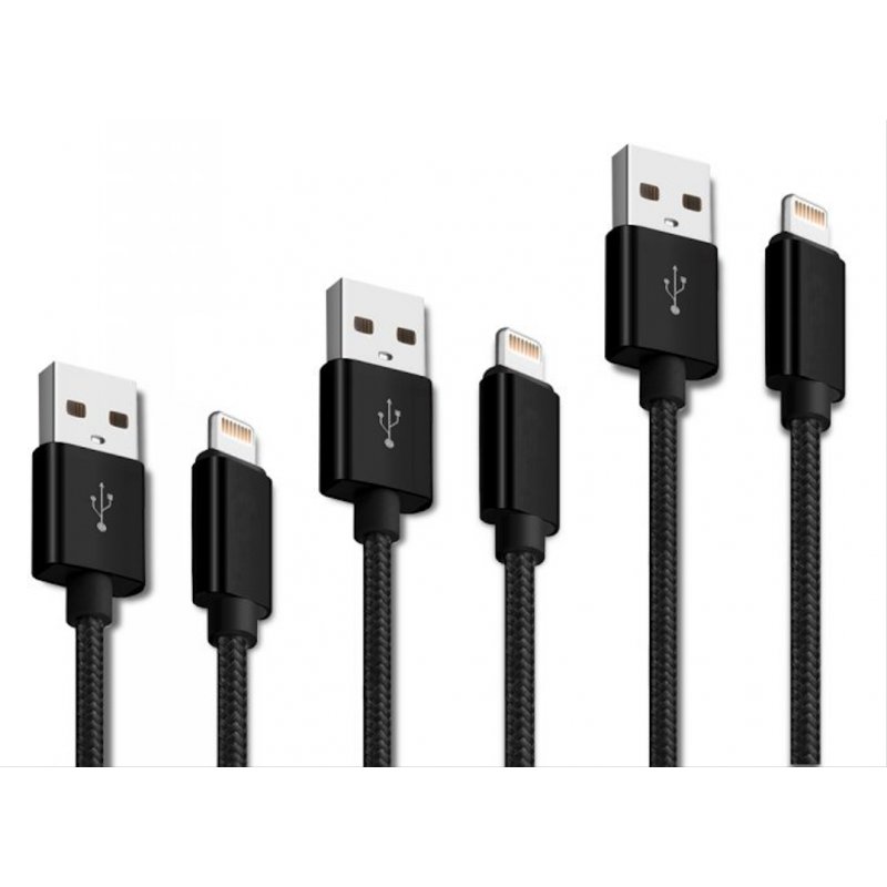Lot 3 câbles Lightning 1 m-2m-3m noir : Une tension de 2.5V, un taux de conversion de 2.4A 85% ~ 95%. Le câble dispose d’une vitesse de charge bonne qualité et d’une transmission stable. La gaine en fibres de nylon de haute qualité offre une protection supplémentaire pour éviter d'endommager le câble lorsqu'il est plié. Utilisez ce câble USB pour recharger votre Appareil depuis votre Mac ou votre PC Windows ou bien à partir d'une prise murale (non fournie).Très pratique d'utilisation, préférez ce câble pour une charge stable et en toute sécurité. La conception du circuit sophistiqué avec la protection contre la surintensité, la surcharge et le court-circuit. Pack de 3 pour diverses occasions: la longueur de 1 mètre vous permet d’atteindre facilement un port USB en avant/arrière des ordinateurs/adaptateurs muraux. La longueur de 2 mètres, à savoir la longueur parfaite pour la chambre/le bureau, peut charger votre iPhone commodément. La longueur de 3 mètre vous permet de charger librement pour de plus longue distance