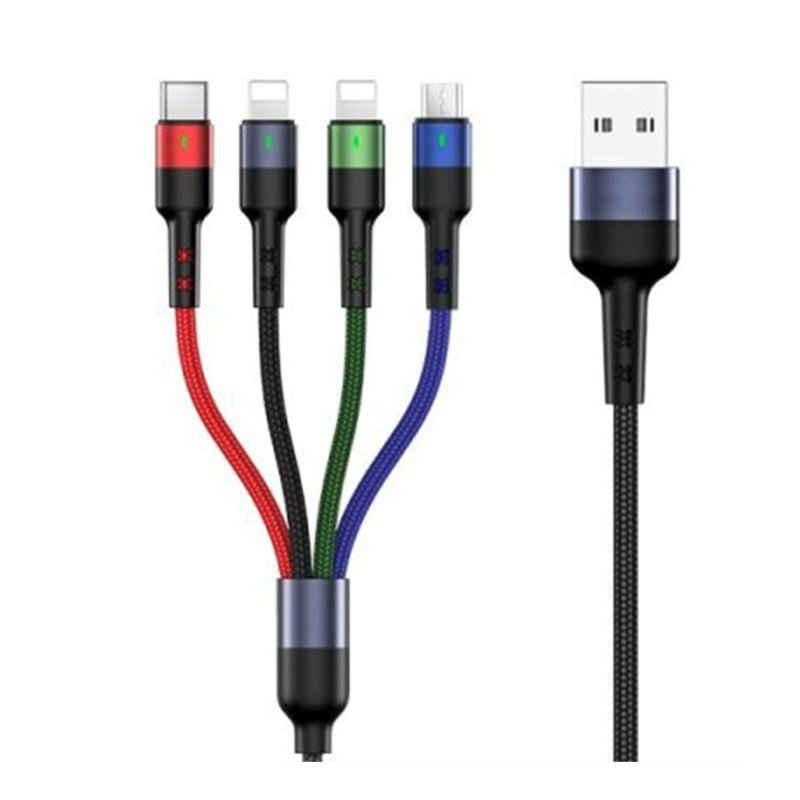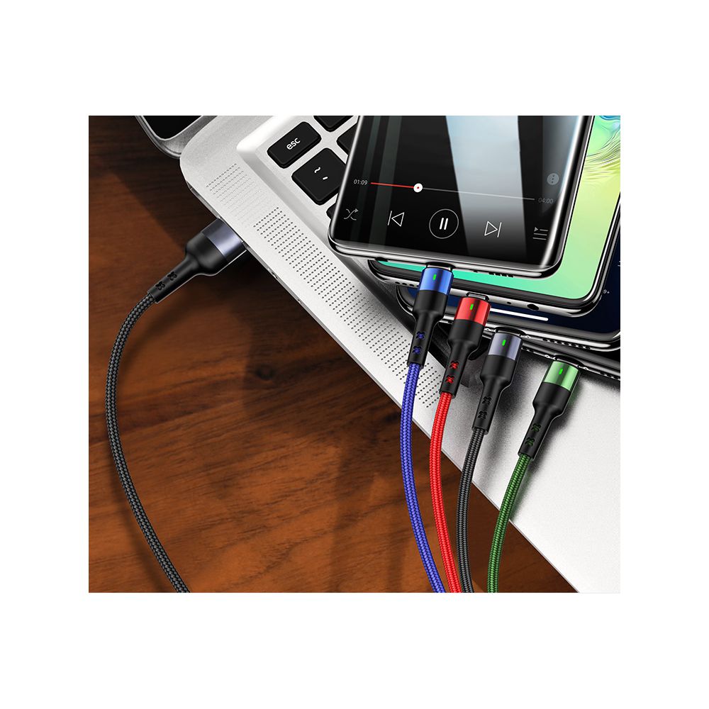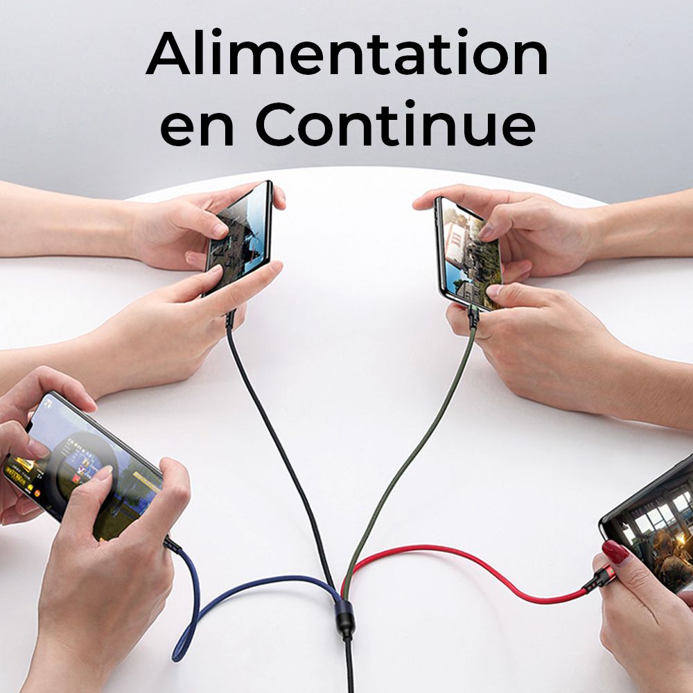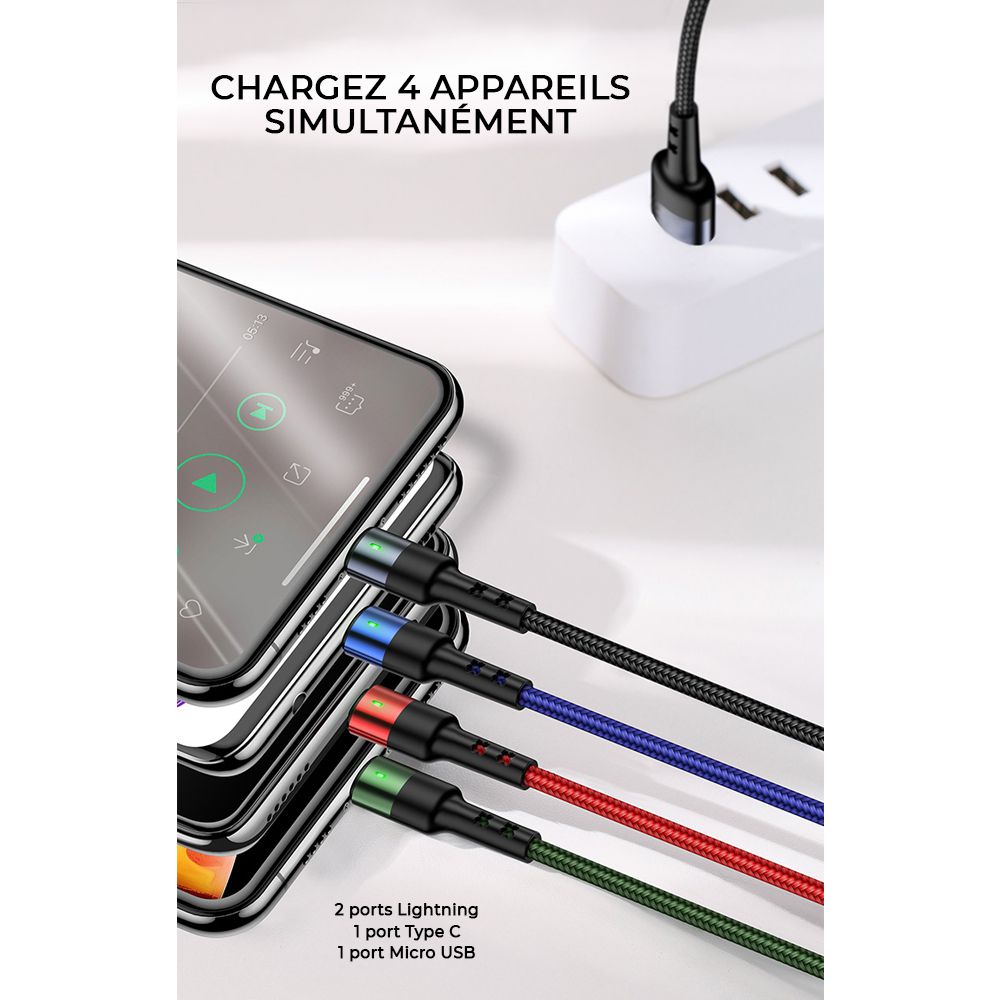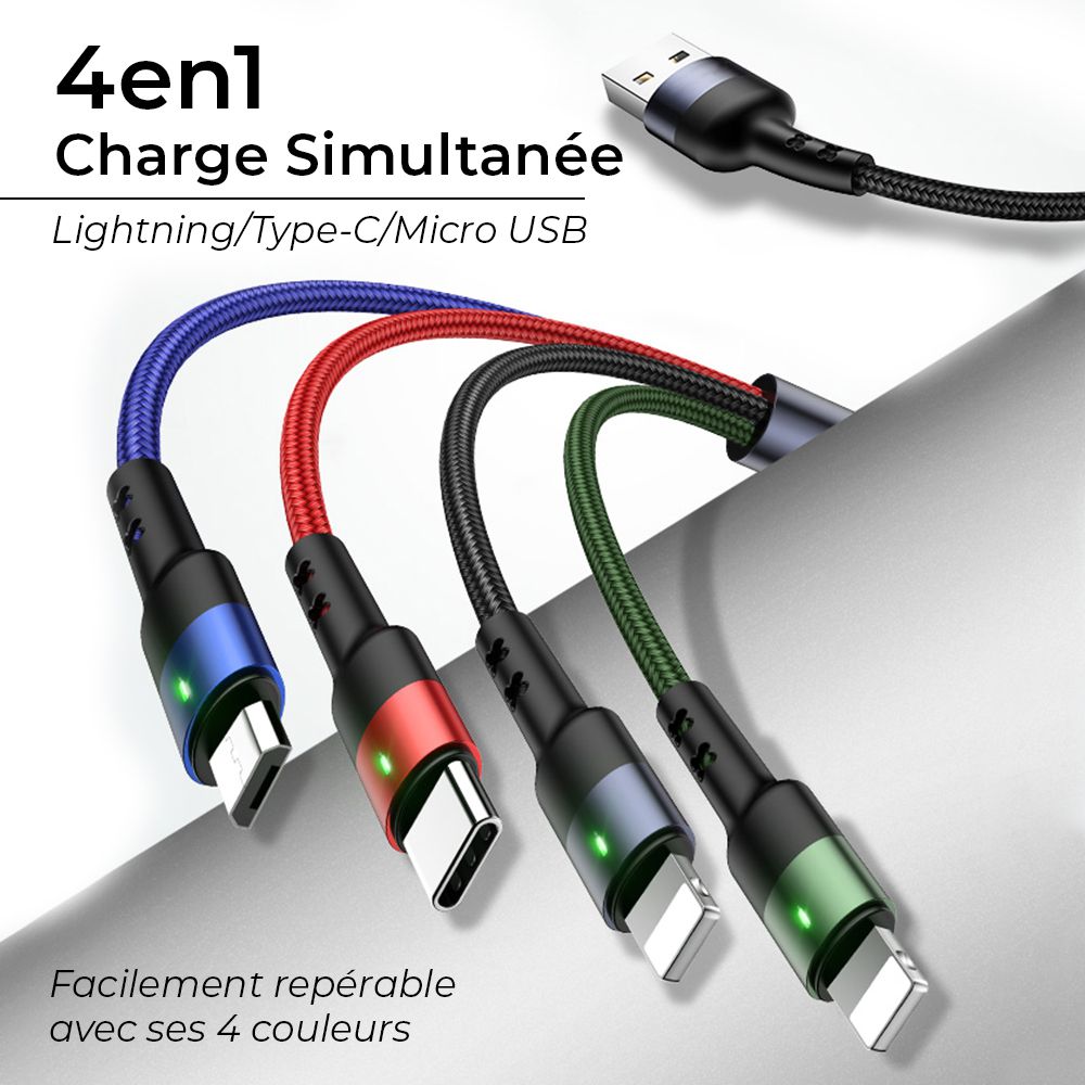 Câble de charge et de syncronisation de 3m 4 en 1 lighnting(x2) ,micro USB et Type C est un produit qui convient à tout type de smartphone grâce à la présence des 4 embouts 2xlighning, microUSB et USB-C. De plus cela vous permet de charger 4 appareils en même temps.Le câble permet une charge rapide jusqu'à 2A et un transfert de données pour les appareils Apple.Le câble nylon garantit une utilisation longue sans risque de dommages mécaniques.Câble équipé d'une puce intelligentequi protégera des surtensions inattendues.Caractéristiques :- Témoin lumineux de charge douce- Embouts renforcés avec matière souple- Matériel: armure en nylon + alliage d'aluminium, flexible et durable en utilisation.- Noyau en cuivre propre et plus épais, chargement sûr et rapide.- Fournit une charge rapide jusqu'à 2A.- Le revêtement en aluminium et le tissage en nylon tressé garantissent une longue durée de vie.- Disposition intelligente. Protection contre les surtensions, sûre à utiliser.- Construction résistante à la flexion.- Longueur: 3 m