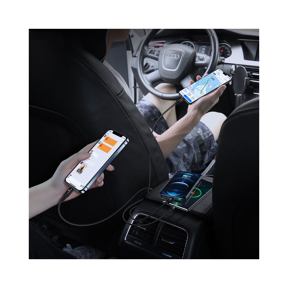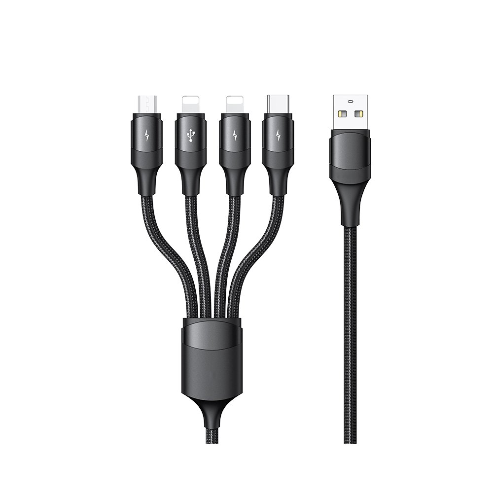 Câble 4 en 1 : lightning, Type-C et Micro USB avec transmission de données et de charge rapide en alliage d'aluminium 1,2 m Caractéristiques:1. 3 types de connecteurs, répondent à tous vos besoins.2. Prise en charge de la charge de 4 appareils en même temps3. Contrôle de la puce intelligente, haute performance.4.Câble tressé fort, anti-traction et sans nœud.Matériel: TPE + alliage d'aluminium + câble tresséLongueur : 1,2 mSortie à port unique : 2 A (maximum)Sortie multi-port : 3A (Max)Compatibilité : pour les appareils avec port Lightning/Micro/Type-CRemarque : un seul connecteur Lightning prend en charge la charge et la transmission de données, mais d'autres connecteurs Lightning/Micro/Type-C ne prennent en charge que la charge.