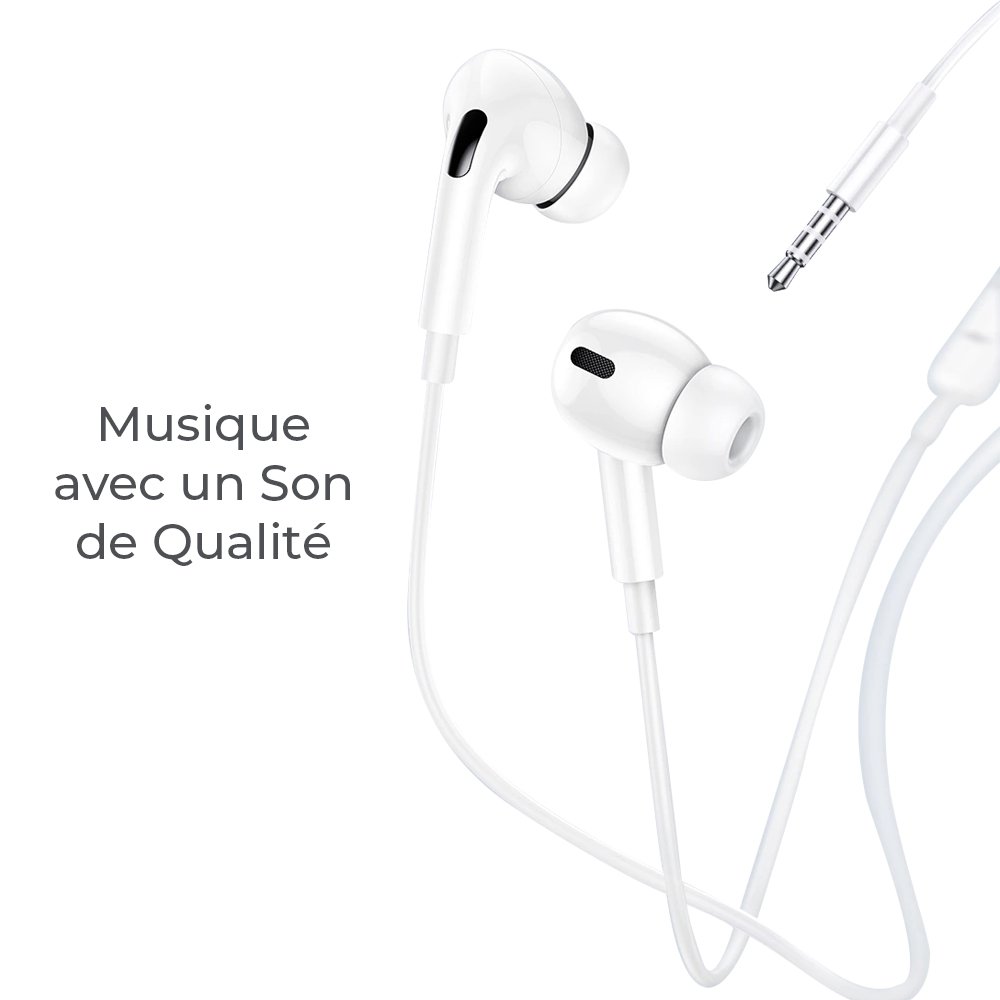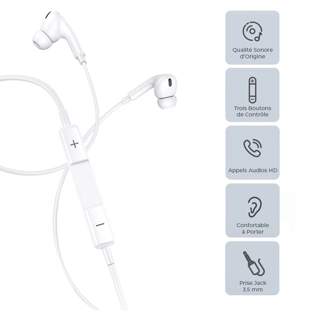 • > Écouteurs filaires intra-auriculaires avec prise jack de 3,5 mm et microphone 1,2 m- blanc