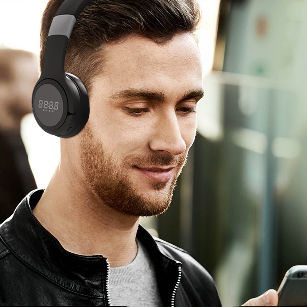 Casque Bluetooth noir avec affichage LED, Support Micro, AUX ,FM, carte TF Caractéristiques du produit: 1). Bluetooth 5.0, fonctionne avec tous les appareils avec fonction Bluetooth ou dispose d'une prise Audio de 3.5mm. 2). Prise en charge de la lecture de carte TF, emplacement de carte micro-sd intégré, prise en charge de 32 go Max, peut être utilisé comme lecteur mp3. 3). Supporte la Radio FM, (veuillez rechercher les statistiques Radio dans l'espace ouvert afin de recevoir un meilleur Signal ) . 4). Haut-parleurs en alliage de 40mm, son Surround stéréo haute qualité, profitez de la musique sans fil HD5). Conversation mains libres : Microphone HD intégré, le casque lui-même dispose d'un bouton de réponse aux appels téléphoniques entrants 6). Le casque dispose d'une prise Audio Standard de 3.5mm prenant en charge le Mode de lecture d'entrée de ligne AUX, vous pouvez utiliser un câble Audio de 3.5mm pour vous connecter au casque pour écouter de la musique utilisé comme casque filaire. 7). Conception pliable, Super léger, les protège-oreilles sont faits de cuir protéique doux et respirant, expérience de port confortable. 8). Conception de batterie amovible et remplaçable, batterie au Lithium de 400mAh, autonomie en veille jusqu'à 20 jours, temps de lecture jusqu'à 8 ~ 10 heures.