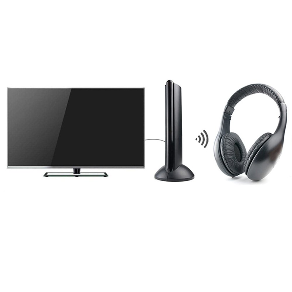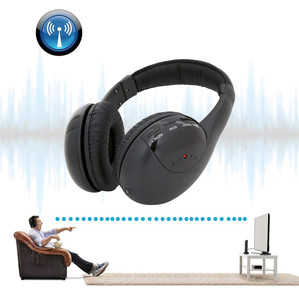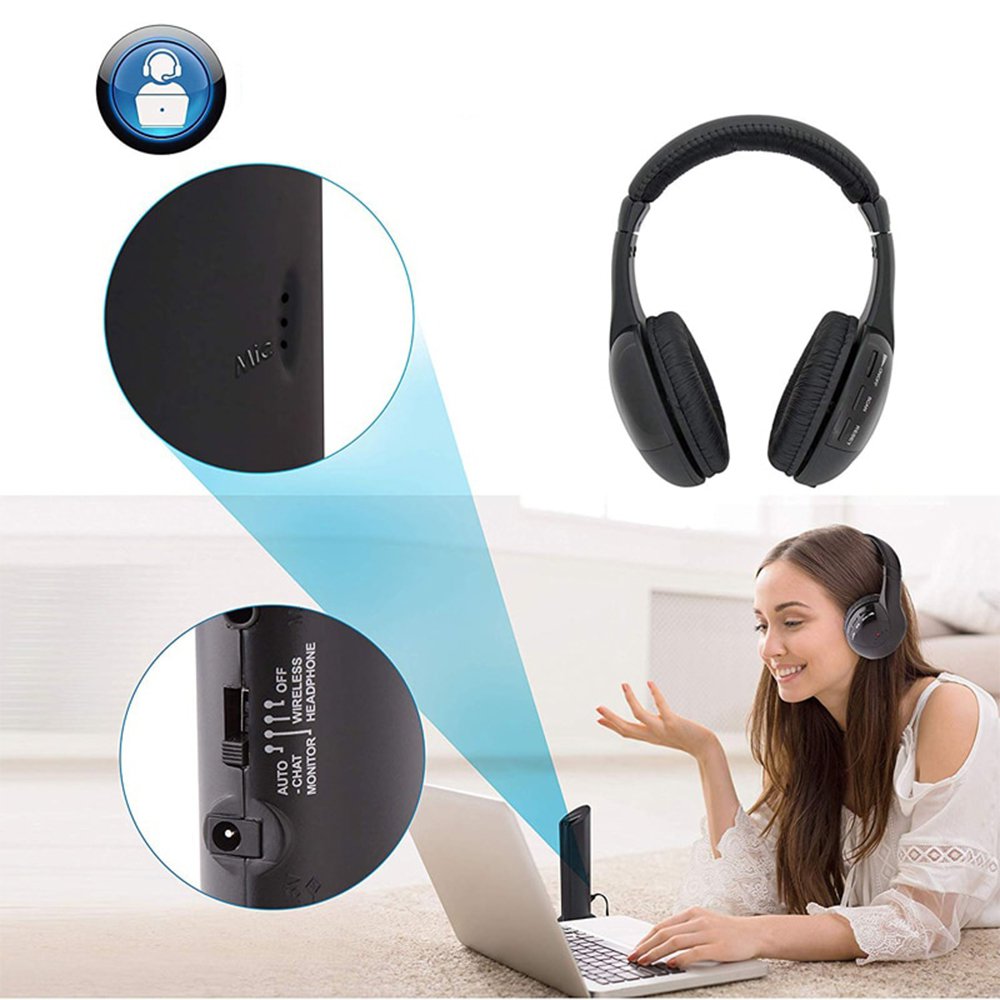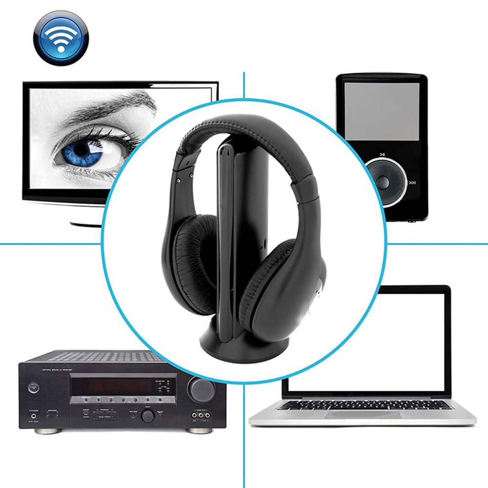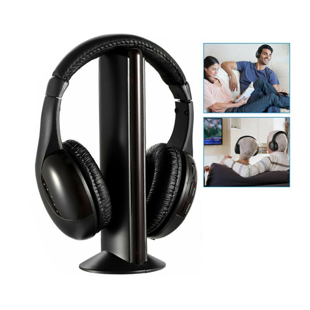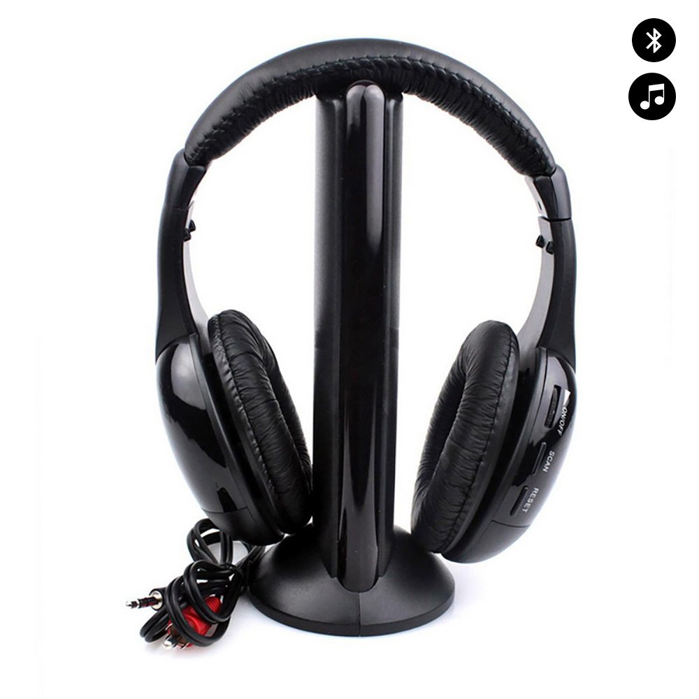 Casque Hifi stéréo 5 en 1, sans fil, avec Radio FM,Microphone HD avec emetteur et support NoirCompatible avec sortie audio tel que son de télévision à canal complet, PC, lecteur de jeu, lecteur DVD, lecteur VCD, appareil audio, lecteur MP3 et lecteur CD.Son TV pleine chaîne: que ferez-vous s'il y a votre programme TV préféré mais que vous craignez de déranger les autres. L'utilisation de l'écouteur sans fil vous permet de regarder un merveilleux programme TV avec la fonction de mise en sourdine ci-dessous.Écoutez votre musique tout en continuant votre activité grâce à la connexion BluetoothLe casque peut être utilisé comme radio FM séparément, ce qui permet de rechercher et de verrouiller les chaînes automatiquement.Équipé d'un câble audio, le récepteur peut être utilisé comme casque filaire sur votre ordinateur ou tablette par exempleSpécifications:Matériau : cuir PU et PVCTaux de distorsion: 1%Impédance: 32ΩL'alimentation nécessite 2 piles AAA dans l'émetteur et 2 piles AAA dans les écouteurs (piles non incluses)Principe sonore: bobine mobileLongueur du fil : environ 1.2mSensibilité: 108dbDiamètre du haut-parleur: 40mmType de prise: type de prise droitePlage de réponse en fréquence: 84-108Hz