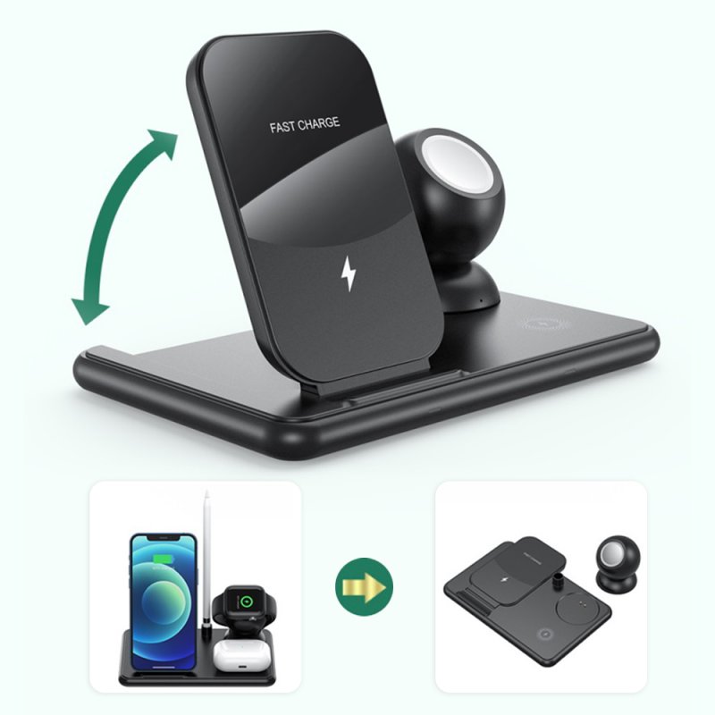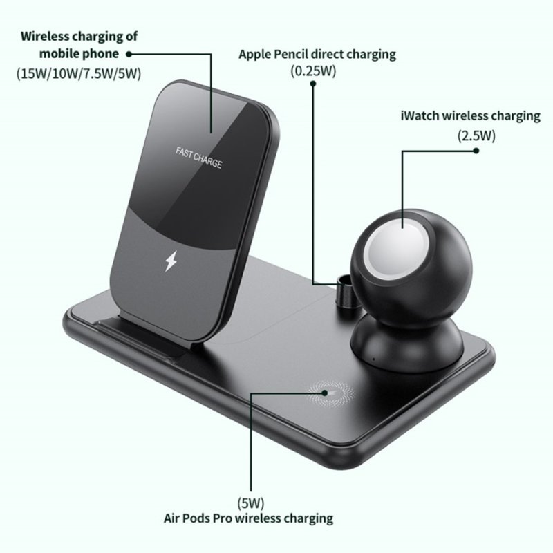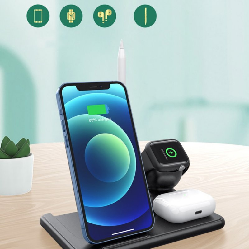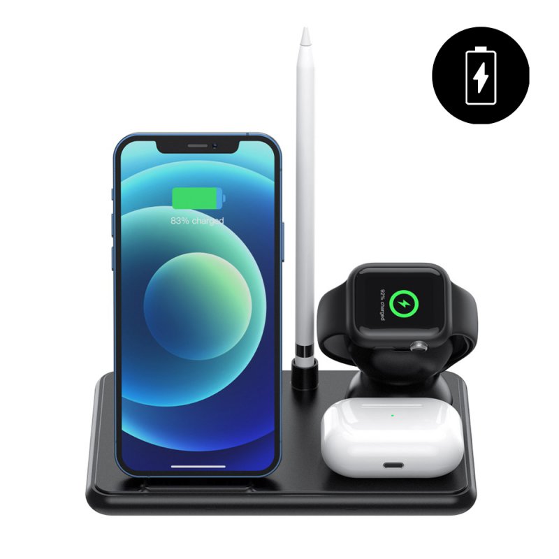 Station de charge puissance 15 W 4 en 1 Compatible avec les produits de la marque Apple iPhone, Airpods, Apple Watch, Stylet Il s'agit d'un chargeur à induction sans fil, conçu pour charger les smartphones, les montres Apple, les écouteurs Airpods et un stylet Apple. Placez simplement le smartphone sur le pad et le chargeur le chargera automatiquement, faites de même à l'endroit désigné pour la montre. Un emplacement spécial pour les écouteurs vous permettra de les recharger et de les utiliser quand vous en aurez besoin. Un chargeur de stylet Apple supplémentaire gardera tout à portée de main. Cela le rend parfait pour une utilisation à la maison ou au bureau. Le chargeur 4 en 1 sera parfait pour les personnes qui ont besoin d'énergie et qui ne veulent pas utiliser de câbles.