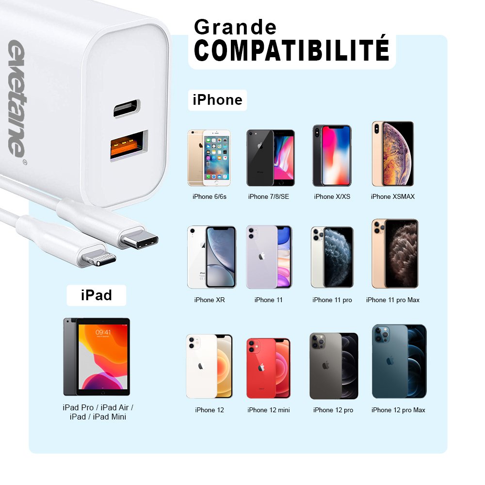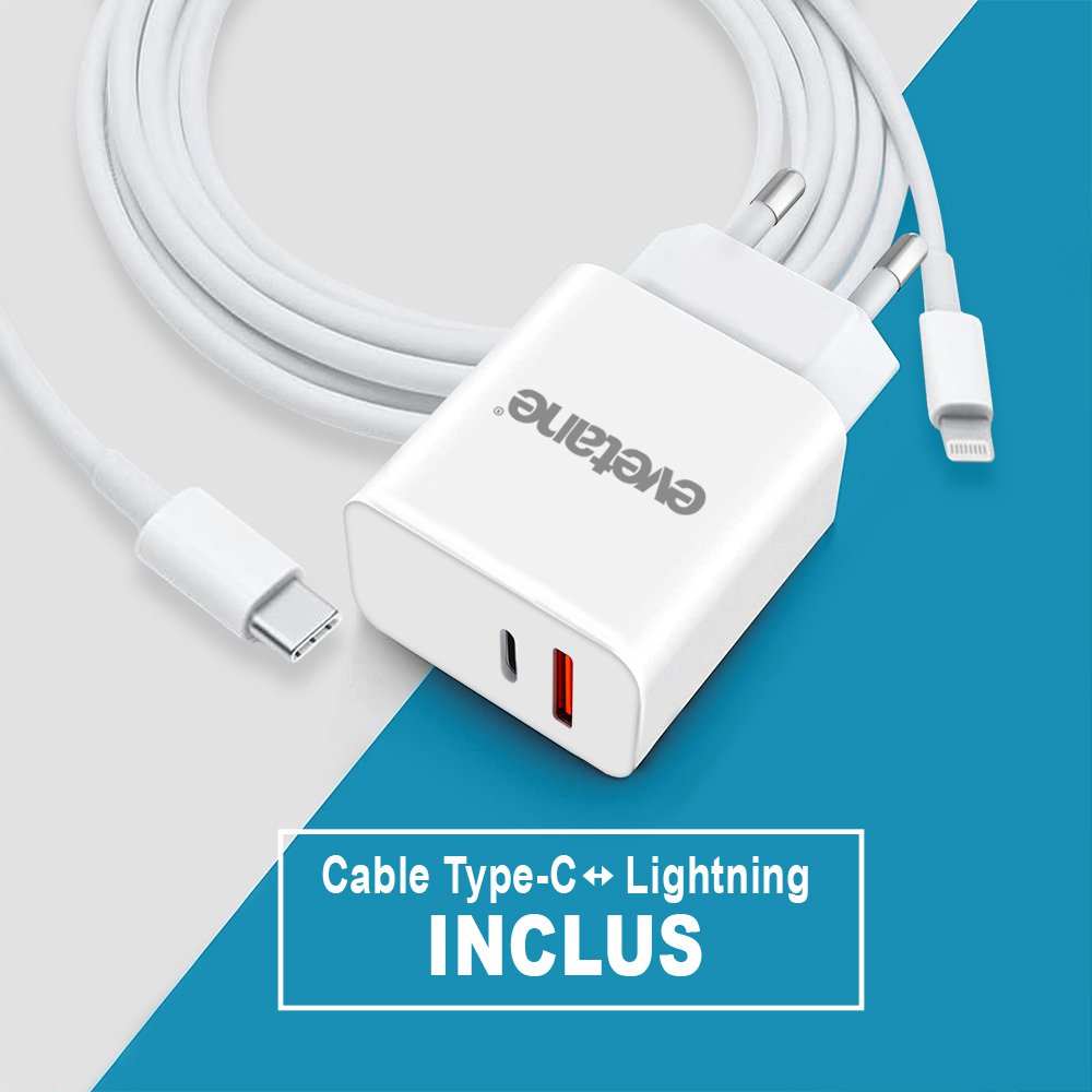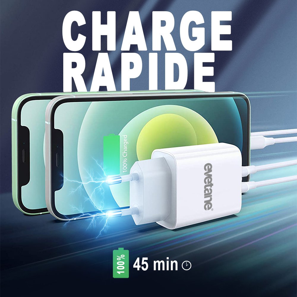 Chargeur rapide de 20 W à charge intelligente compatible avec la charge rapide. Ce chargeur bénéficie d'une intensité 4A, de 2 ports USB. Grâce aux systèmes intelligents du chargeur, l'alimentation électrique dispose d'une protection de sécurité. Design Compact avec composants Puissants. Le chargeur double USB soit USB et USB C, permet la charge de deux appareils en même temps et donc d'une double puissance. Tension de sortie :Type C PD PPS: TYPE-C-5V3A/9V2A/12V1.5A USB QC3.0 port: :5V3A/9V2A/12V1.5A Tension de sortie totale: 5V 4AAttention, le chargeur ne pourra pas fournir une puissance supérieure à la capacité de votre téléphone. Si par exemple votre téléphone bénéficie d'une puissance de 15 W, la puissance envoyée par le chargeur ne sera pas supérieure à ce que votre téléphone pourra supporter.