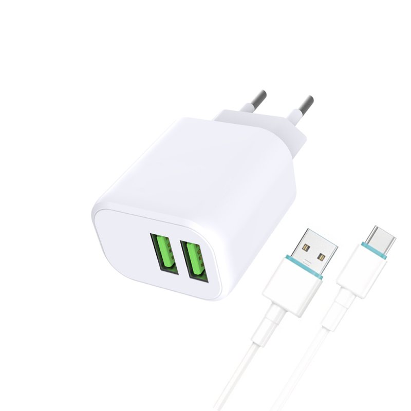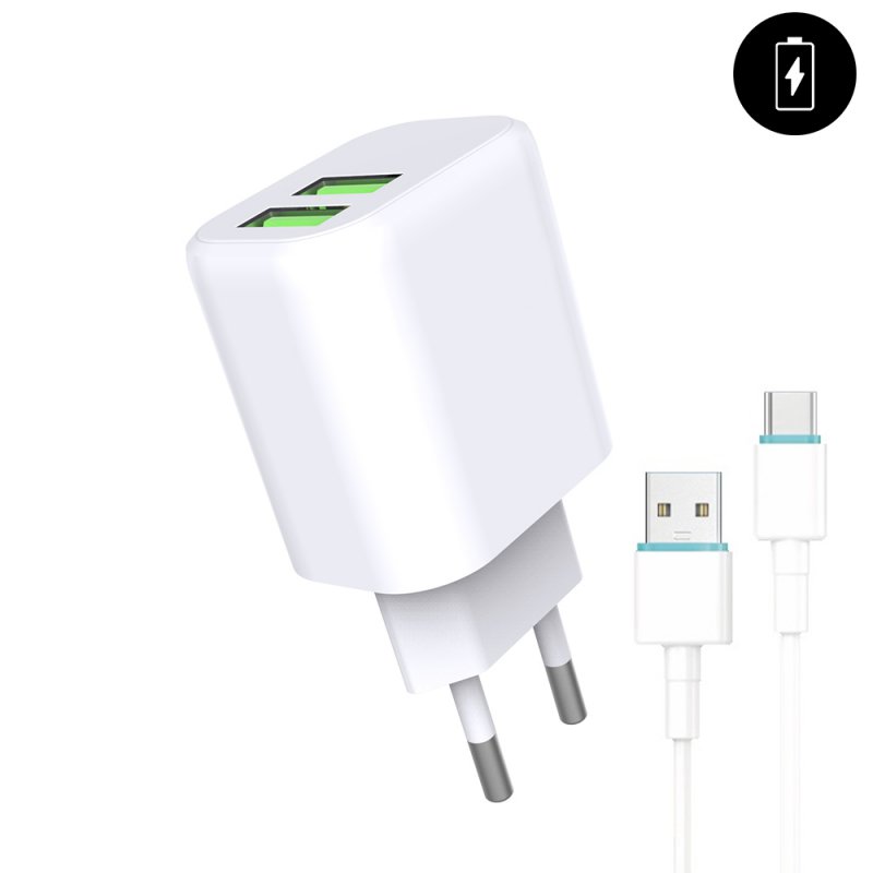 Chargeur secteur 2x USB 2,4A + cable USB-C - USB - Blanc