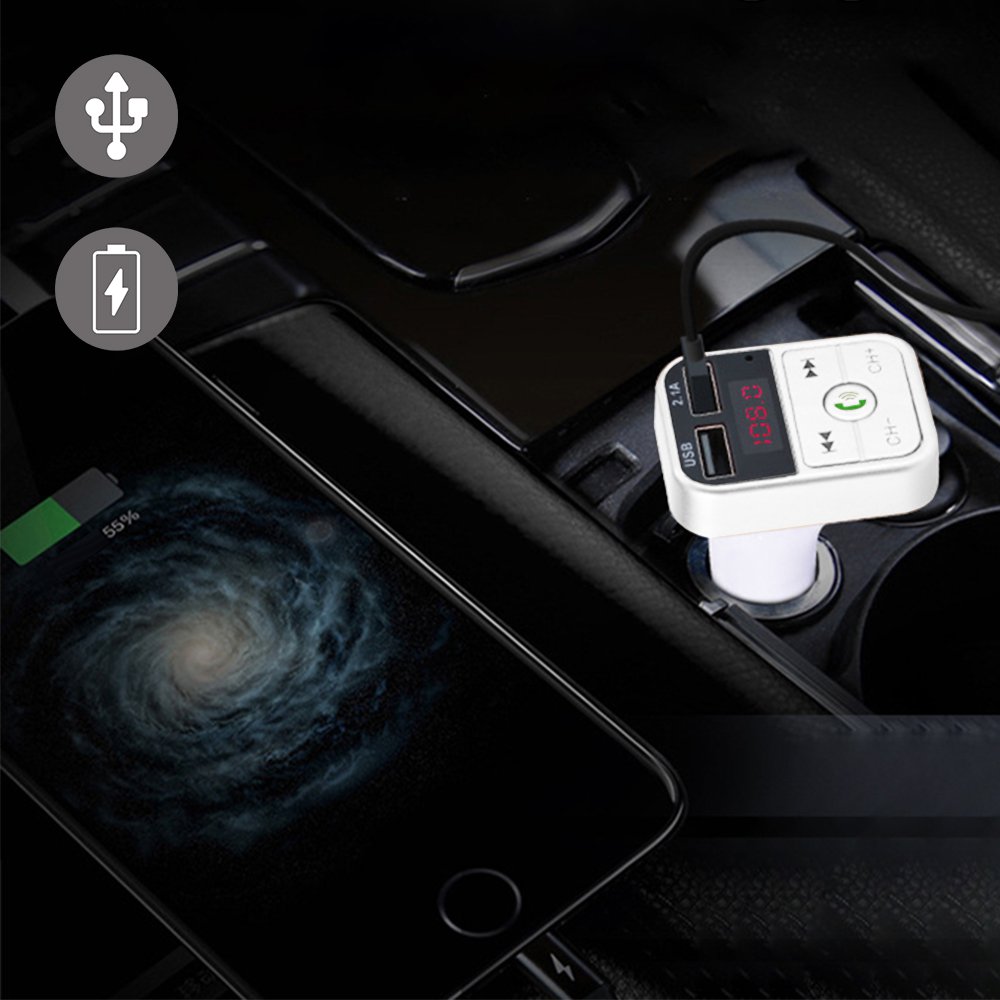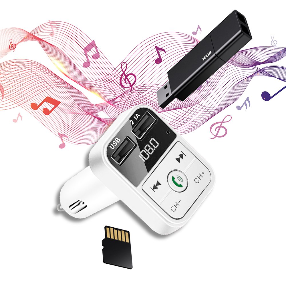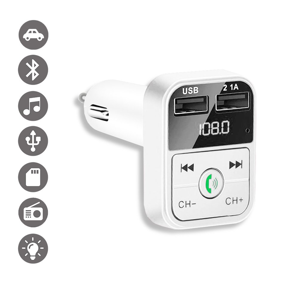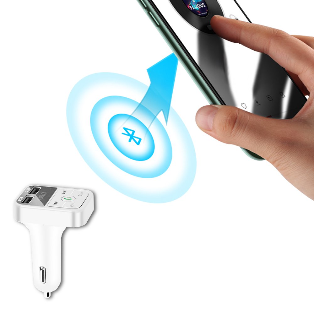 • Transmetteur FM Bluetooth et chargeur voiture avec double USB Blanc 2,1A