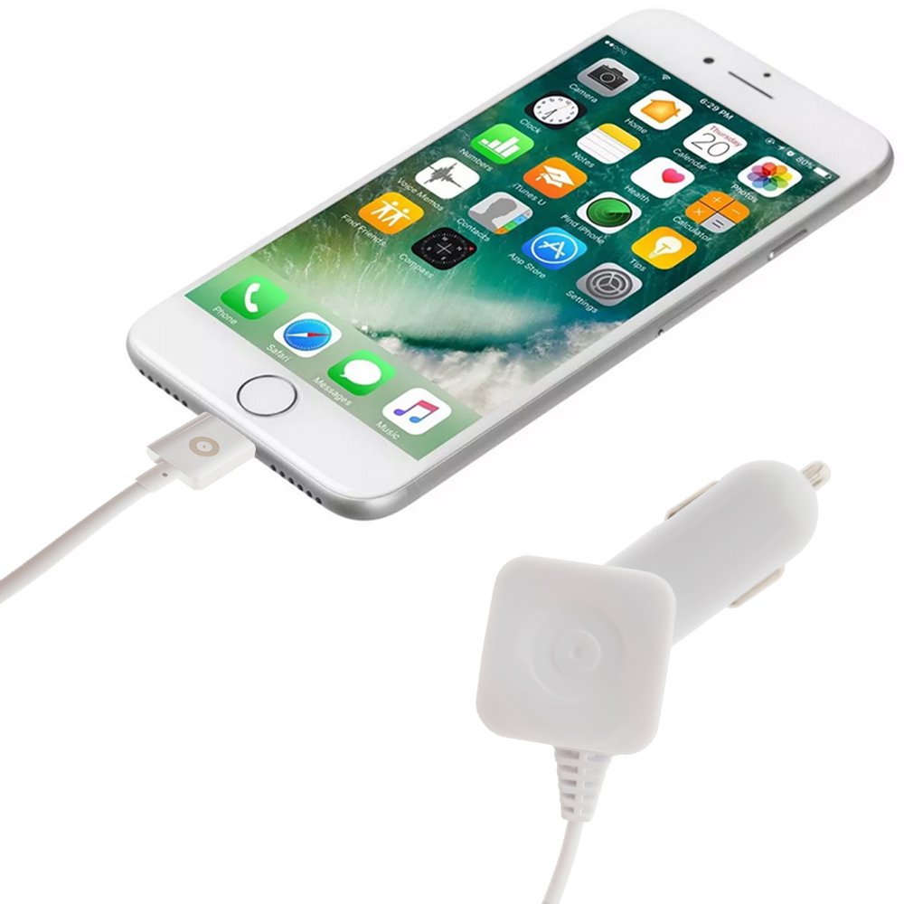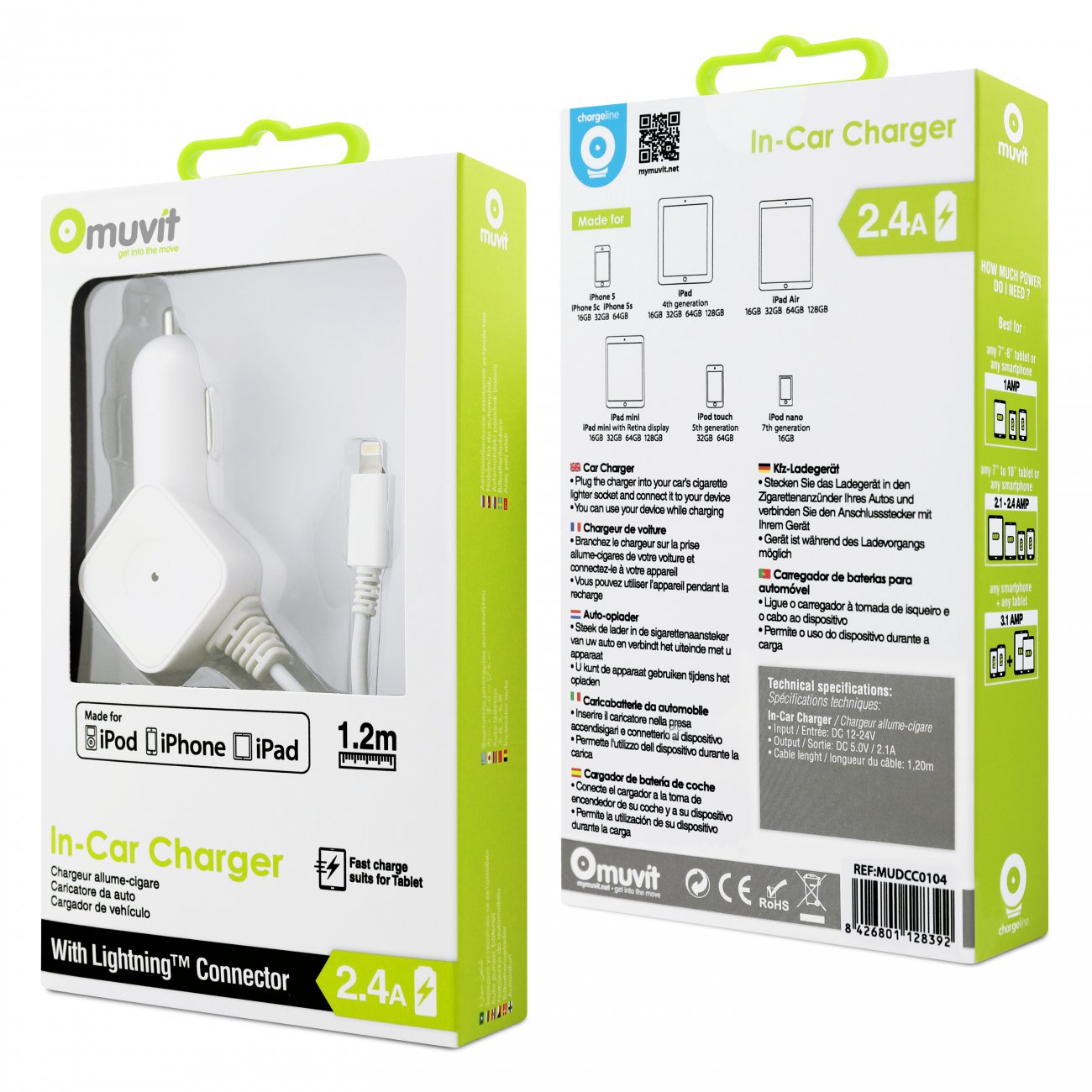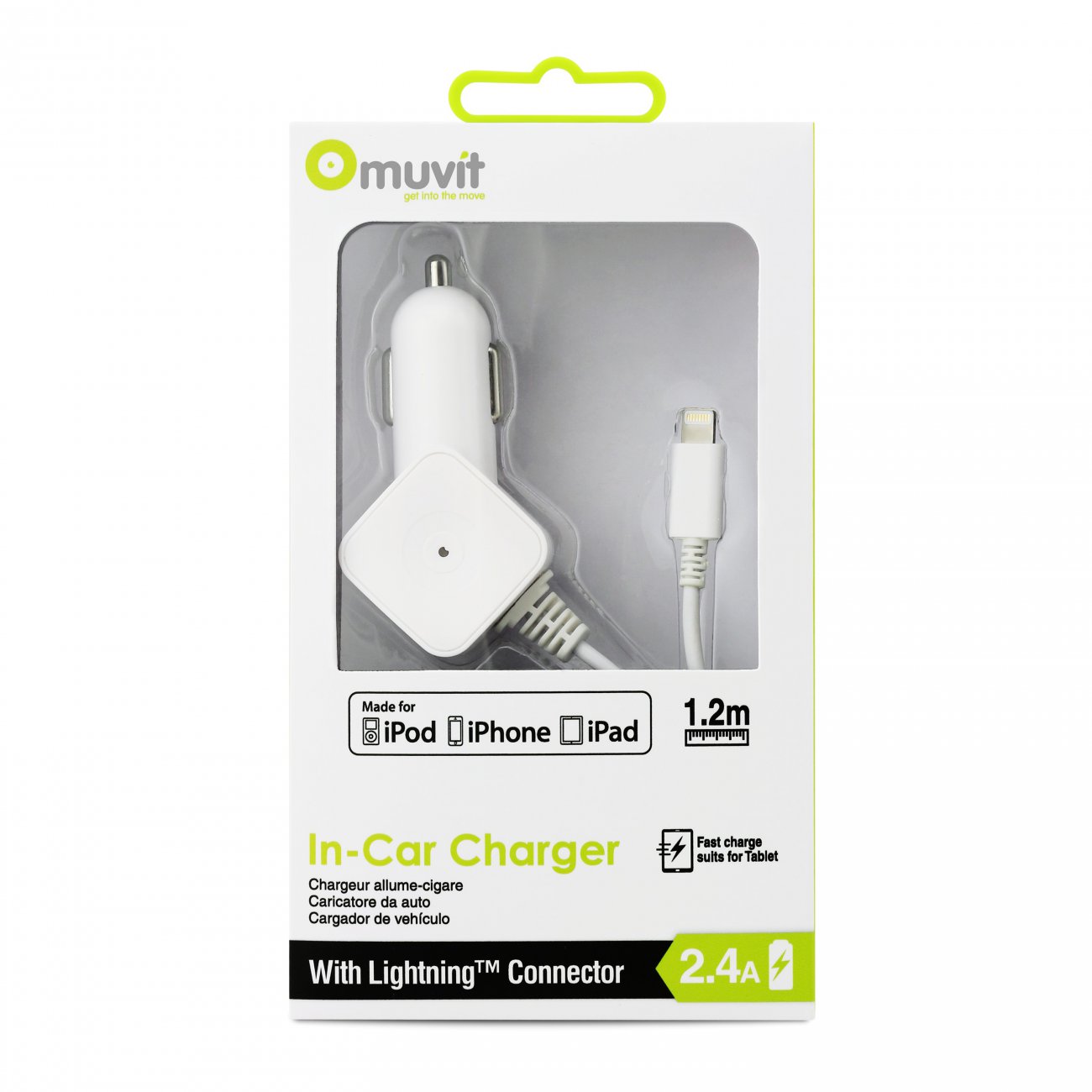 • Chargeur voiture muvit compatible avec Apple Lightning MFI 2.4A 1.2m blanc