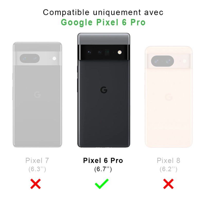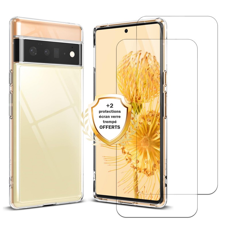 Pack coque anti-choc + 2 verres trempés, offrant une protection intégrale compatible avec votre Google Pixel 6 Pro contre les chocs, les rayures et la poussière. Kit de nettoyage et d'installation inclus.