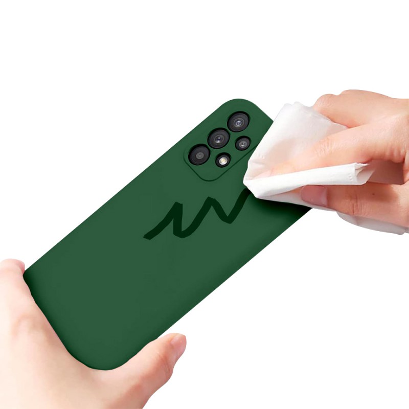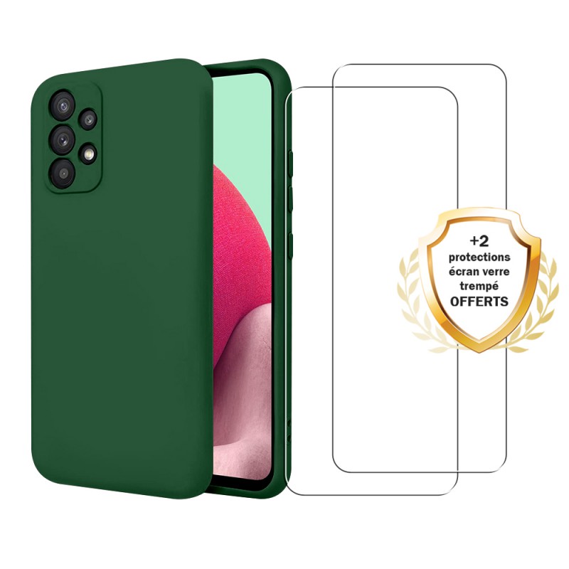 Pack coque silicone liquide verte + 2 verres trempés, offrant une protection intégrale compatible avec votre Galaxy A32 contre les chocs, les rayures et la poussière. Compatible avec chargement sans fil (induction). Kit de nettoyage et d'installation inclus.