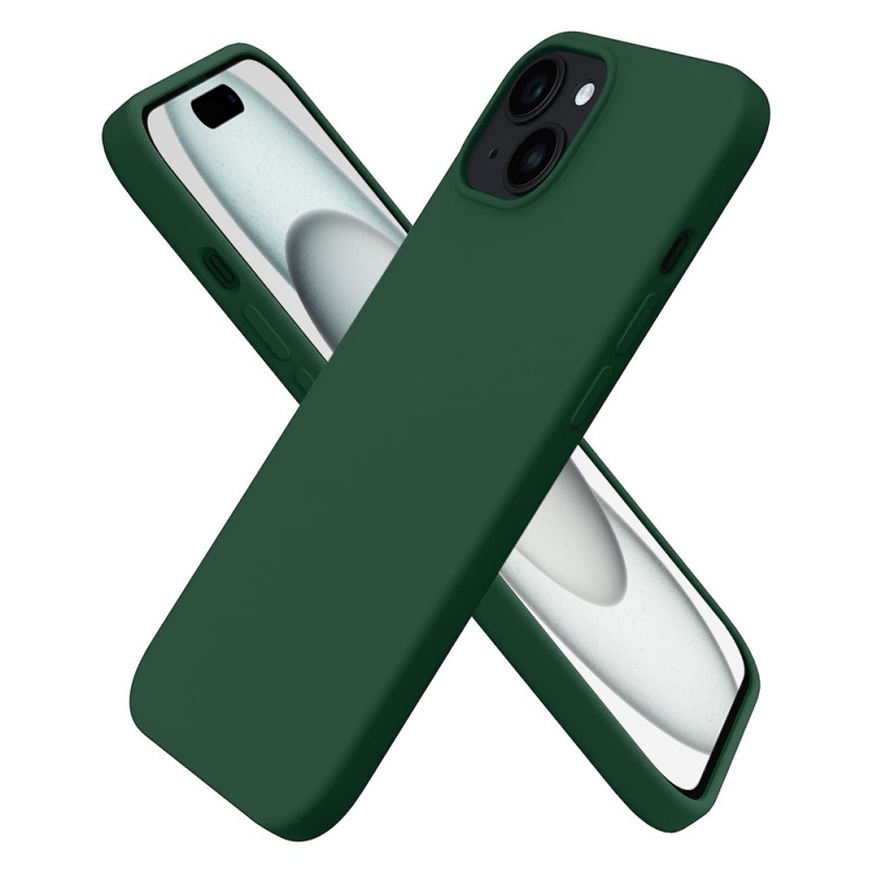 Pack coque silicone liquide verte + 2 verres trempés, offrant une protection intégrale compatible avec votre Phone 15  contre les chocs, les rayures et la poussière. Compatible avec chargement sans fil (induction). Kit de nettoyage et d'installation inclus.