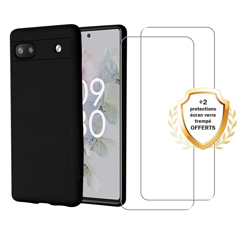 • Coque Google Pixel 6A Silicone liquide Noire  + 2 Vitres en Verre trempé Protection écran Antichocs