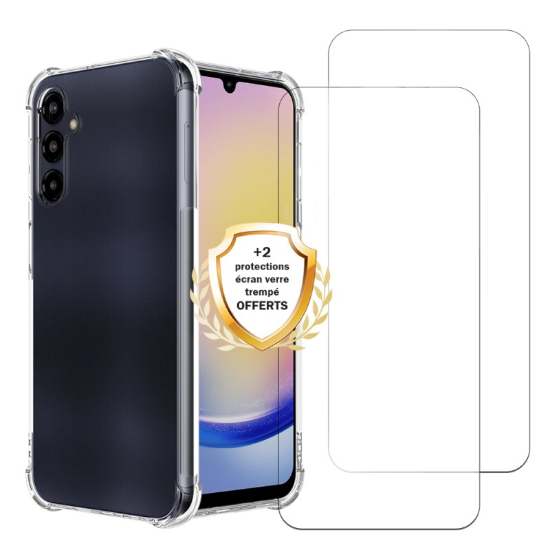 • Coque Samsung Galaxy A25 Antichoc coins renforces Silicone + 2 Vitres en verre trempe Protection ecran
