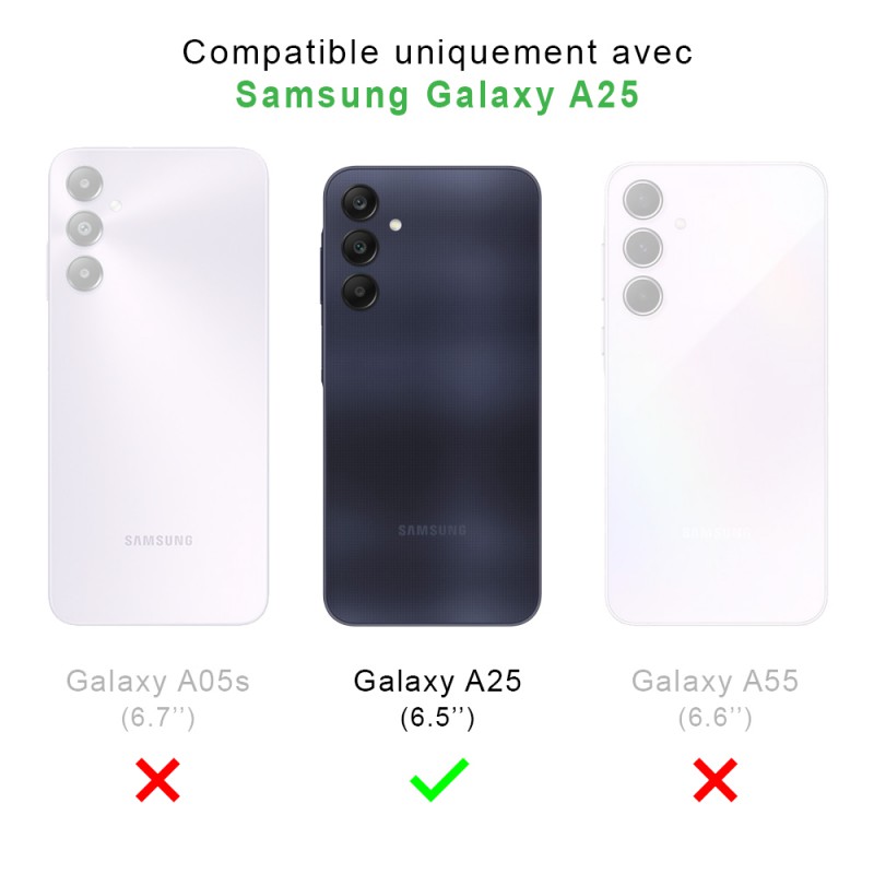 Pack coque anti-chocs Galaxy A25 + 2 verres trempés pour une protection intégrale contre les chocs, les rayures et la poussière. Les fonctionnalités tactiles de l'écran sont préservées.