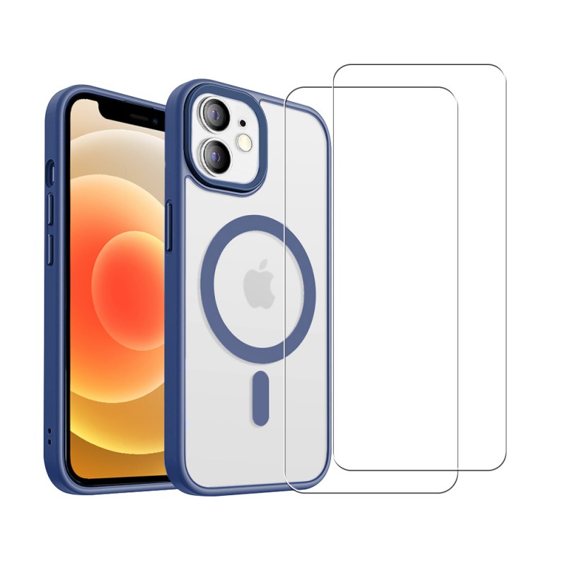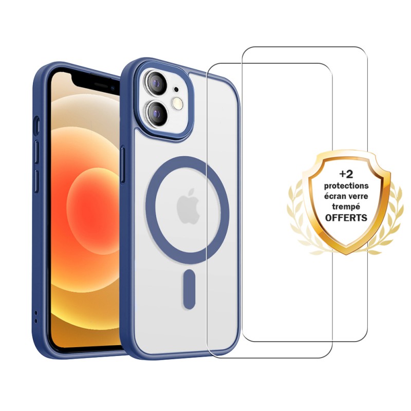 Coque iPhone 12 Mini Bleue et transparente fumée Compatible Magsafe + 2 Vitres Protection ecran