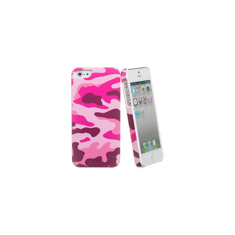 Développée par le français Muvit, cette coque rigide rose avec motif camouflage a été spécialement créée pour protéger la façade arrière et les contours de l'Iphone 5 / 5S d'Apple.