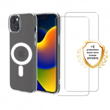 Coque anti-choc compatible avec iPhone 15 Plus . Cette coque avec 4 coins renforcés augmente le niveau de protection, même en cas de chute. Pack coque anti-chocs compatible Magsafe + 2 verres trempés pour une protection intégrale contre les chocs, les rayures et la poussière. Les fonctionnalités tactiles de l'écran sont préservées.
