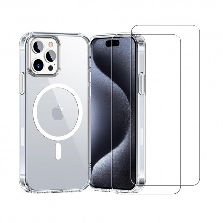 Coque anti-choc compatible avec iPhone 15 Pro Max . Cette coque avec 4 coins renforcés augmente le niveau de protection, même en cas de chute. Pack coque anti-chocs compatible Magsafe + 2 verres trempés pour une protection intégrale contre les chocs, les rayures et la poussière. Les fonctionnalités tactiles de l'écran sont préservées.