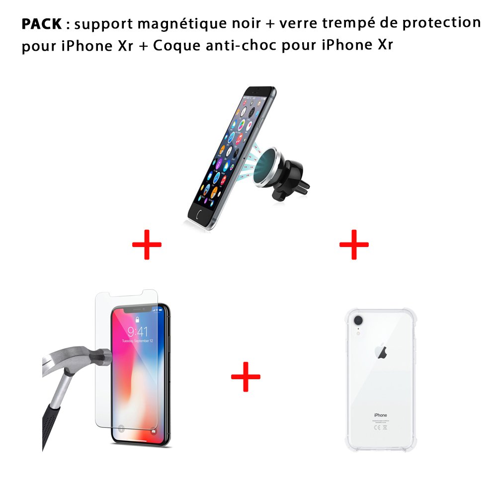 Pack iPhone Xr : Coque anti-choc transparente , vitre de protection et support magnétique noir.
